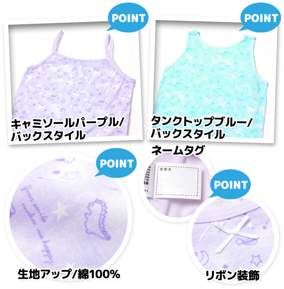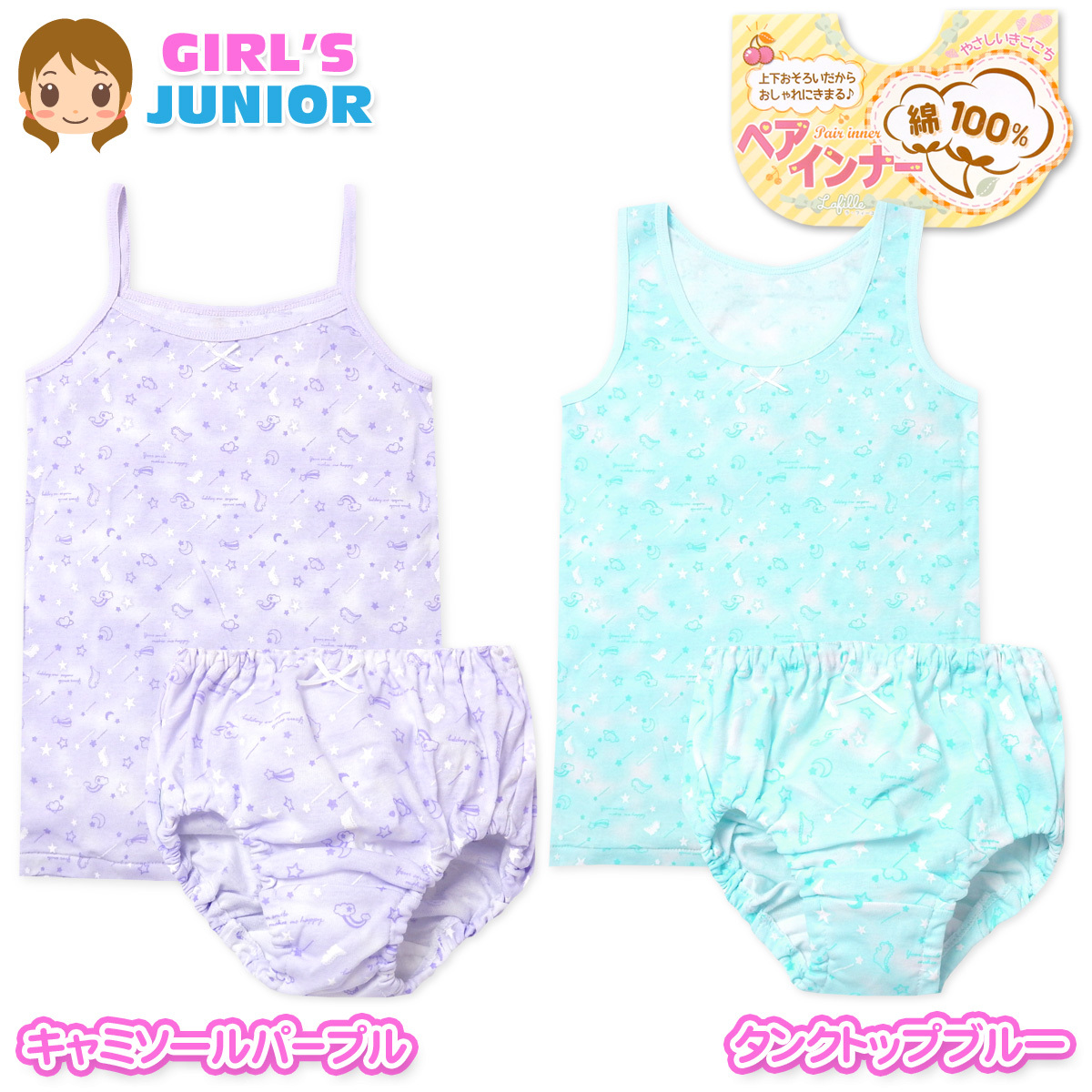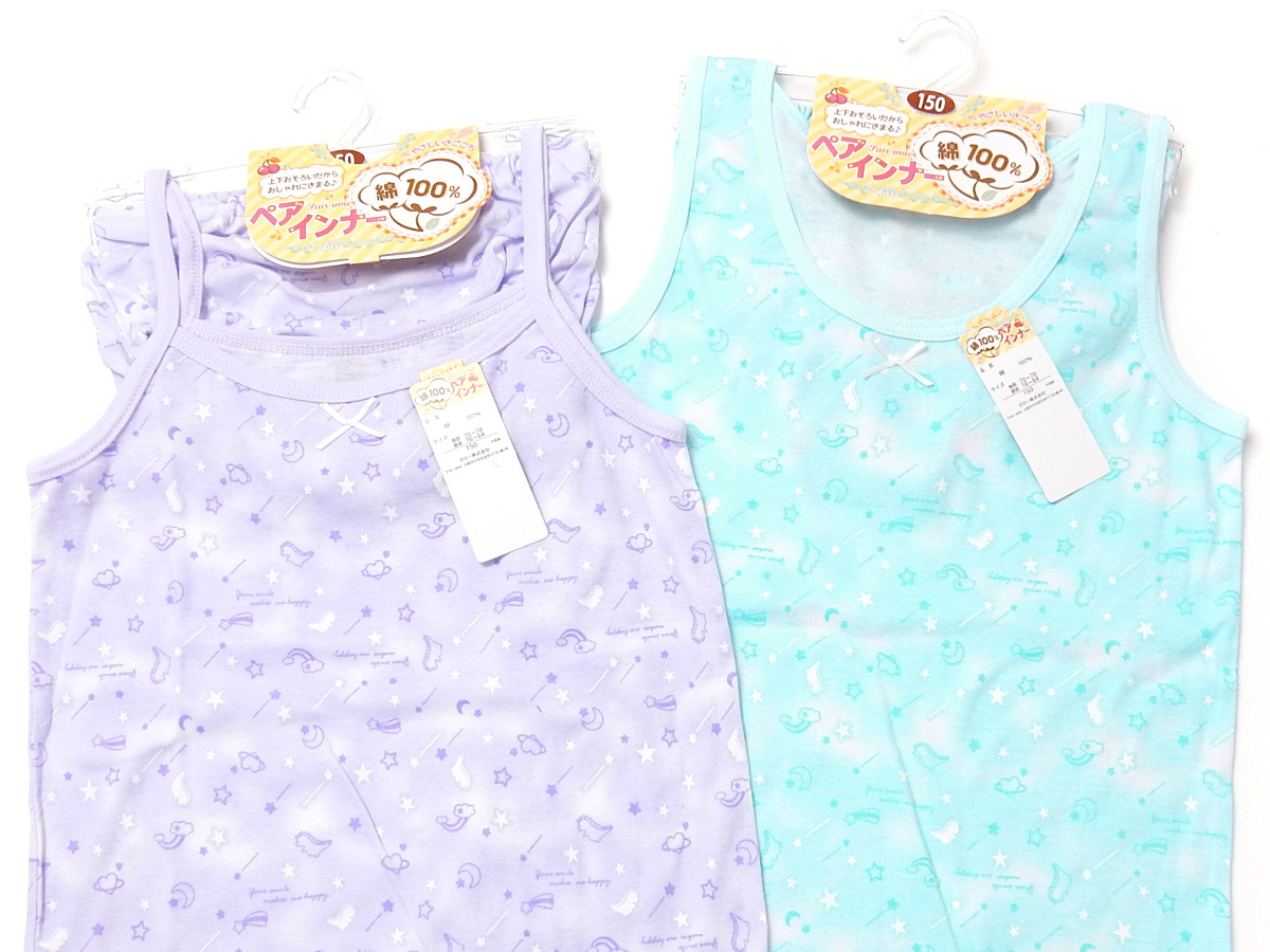 送料無料 女児 ジュニア 綿100% 上下ペア キャミソール タンクトップ ショーツ 恐竜 星柄 リボン 下着 子供 女の子 yg-1444 メール便対応