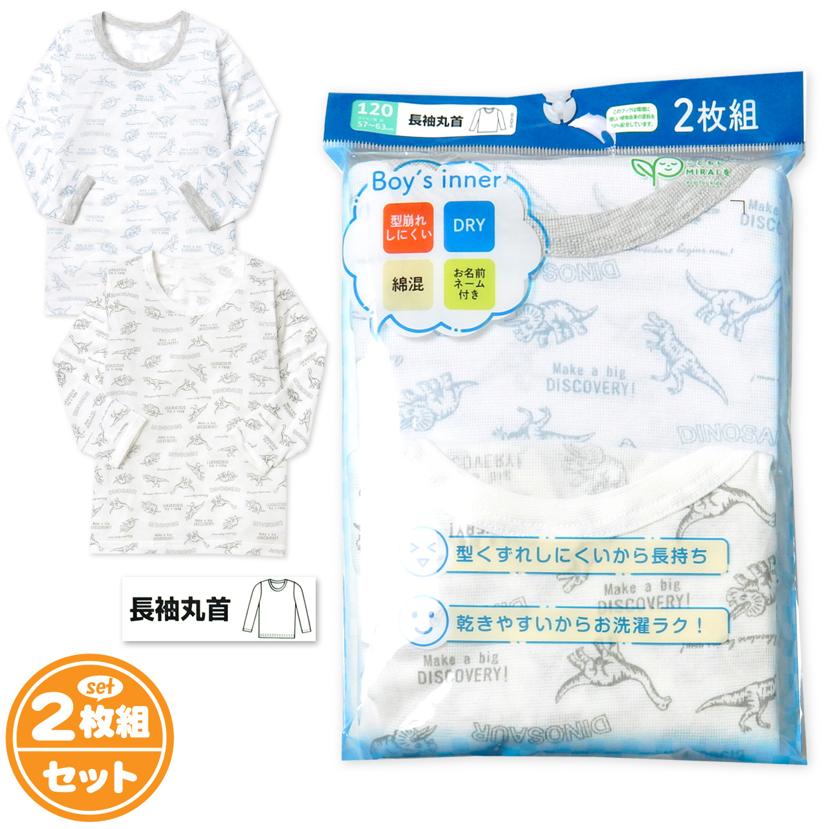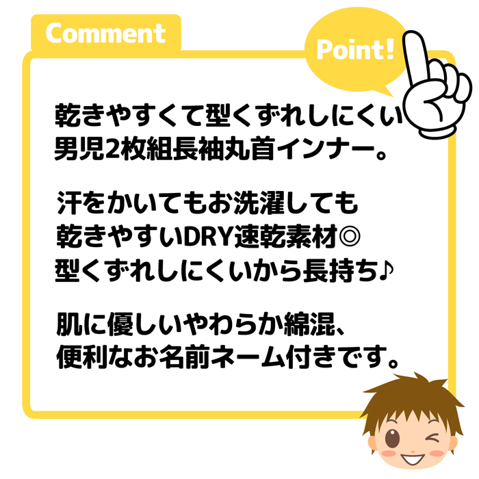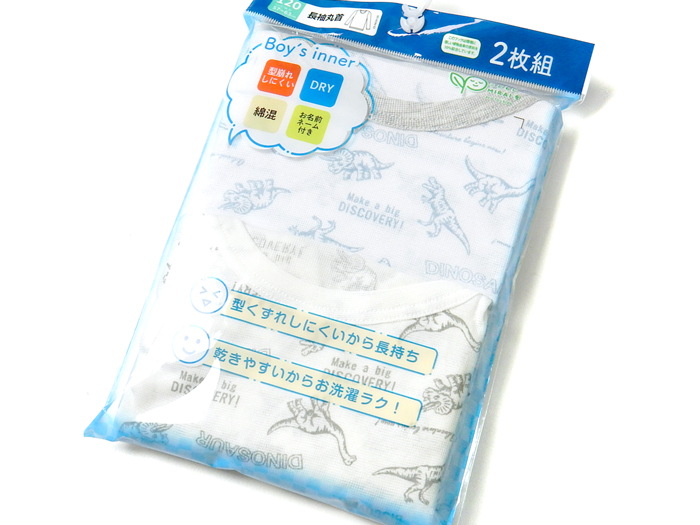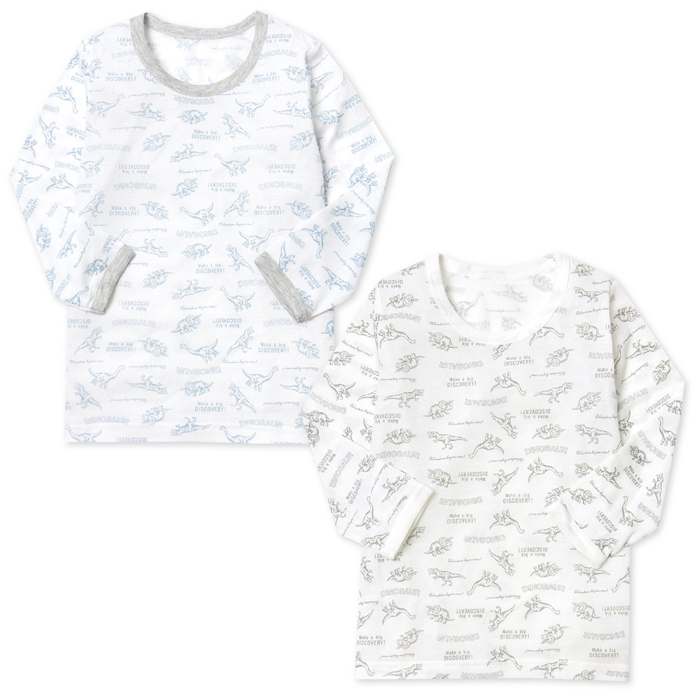 送料無料 2枚組セット 男児 キッズ 長袖 丸首 インナー 肌着 下着 型崩れしにくい DRY 綿混 恐竜柄 ネームタグ 子供 yg-2284b メール便対応