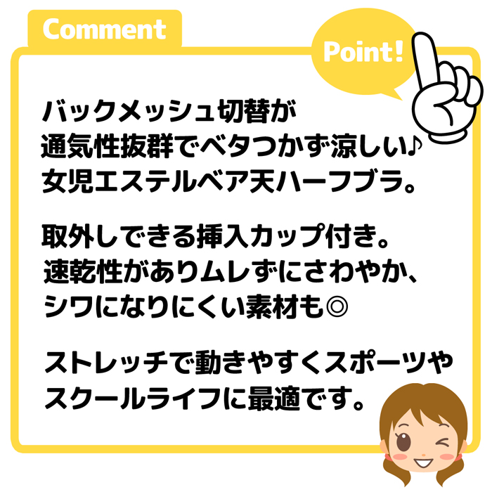 送料無料 女児 ジュニア バックメッシュ ハーフブラ 挿入カップ エステルベア天 通気性 速乾 ストレッチ 下着 yg-3013 メール便対応