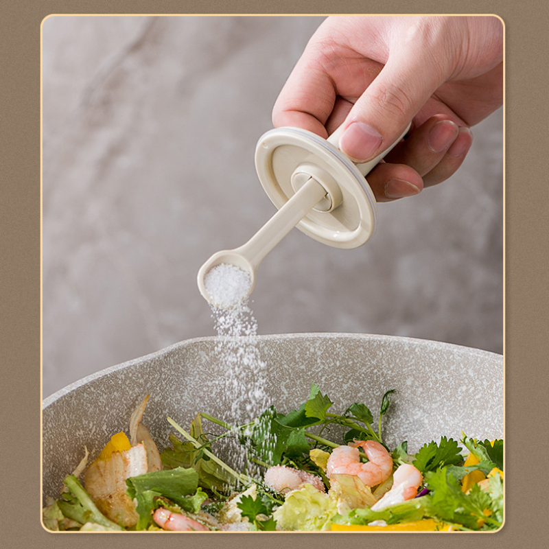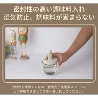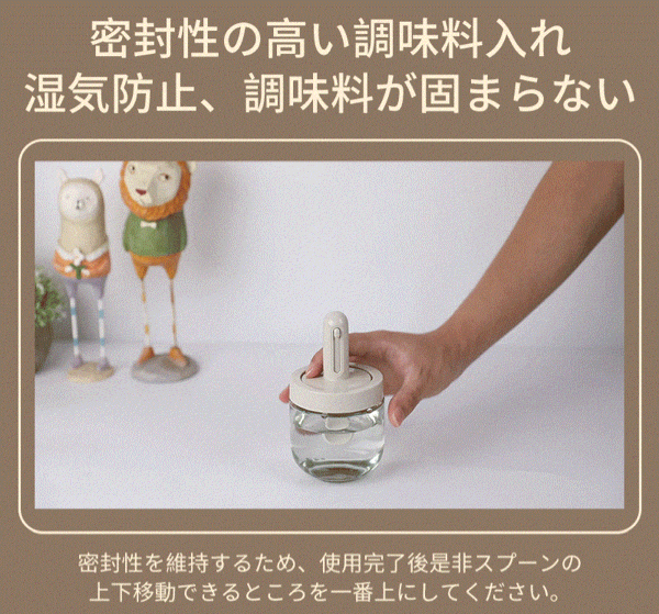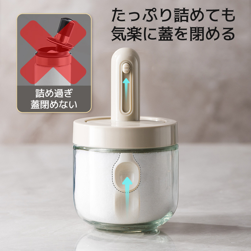 フタと一体になる、伸縮で長さを調節できるスプーン付き。調味料が満杯になっても気楽に蓋を閉めます。一番下まで届きますので調味料を使い切ることができます。