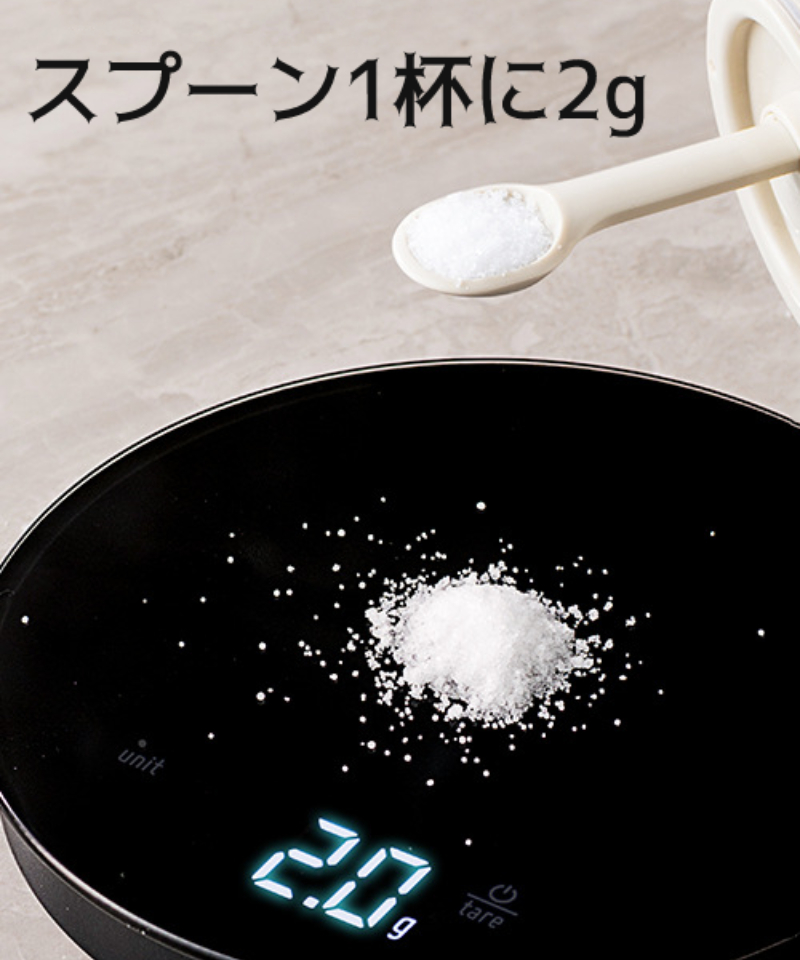 スプーン1杯に2g、料理中ゲージスプーンとして使える、どれくらいの調味料入れたのが把握できます、味が足りないや濃いすぎの可能性を減ります。