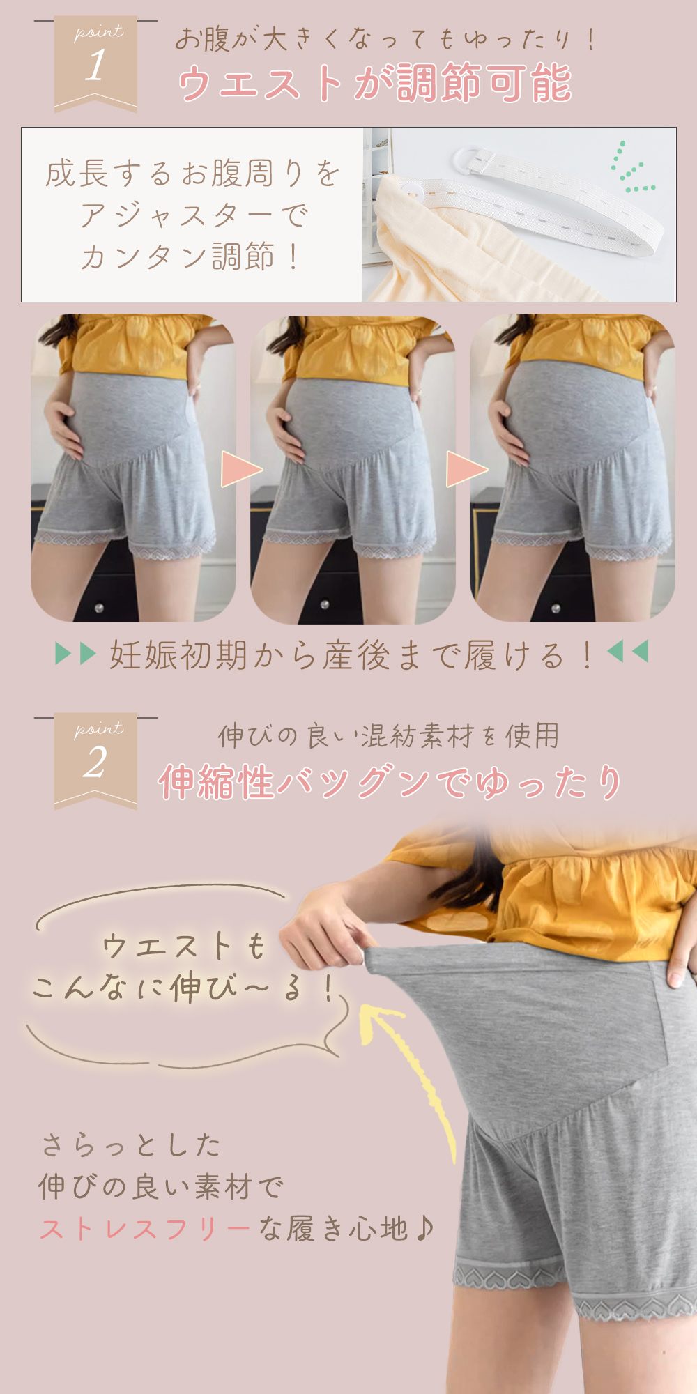 マタニティ/ペチパンツ/ペチコート/1+1枚セット/インナー/ルームウェア/部屋着/マタニティウェア/ショートパンツ/インナーパンツ/スパッツ/肌着/ウエスト調節/アジャスター/伸縮性/ゆったり/レース/妊婦/妊娠中/産前/産後/TN-PPAT/