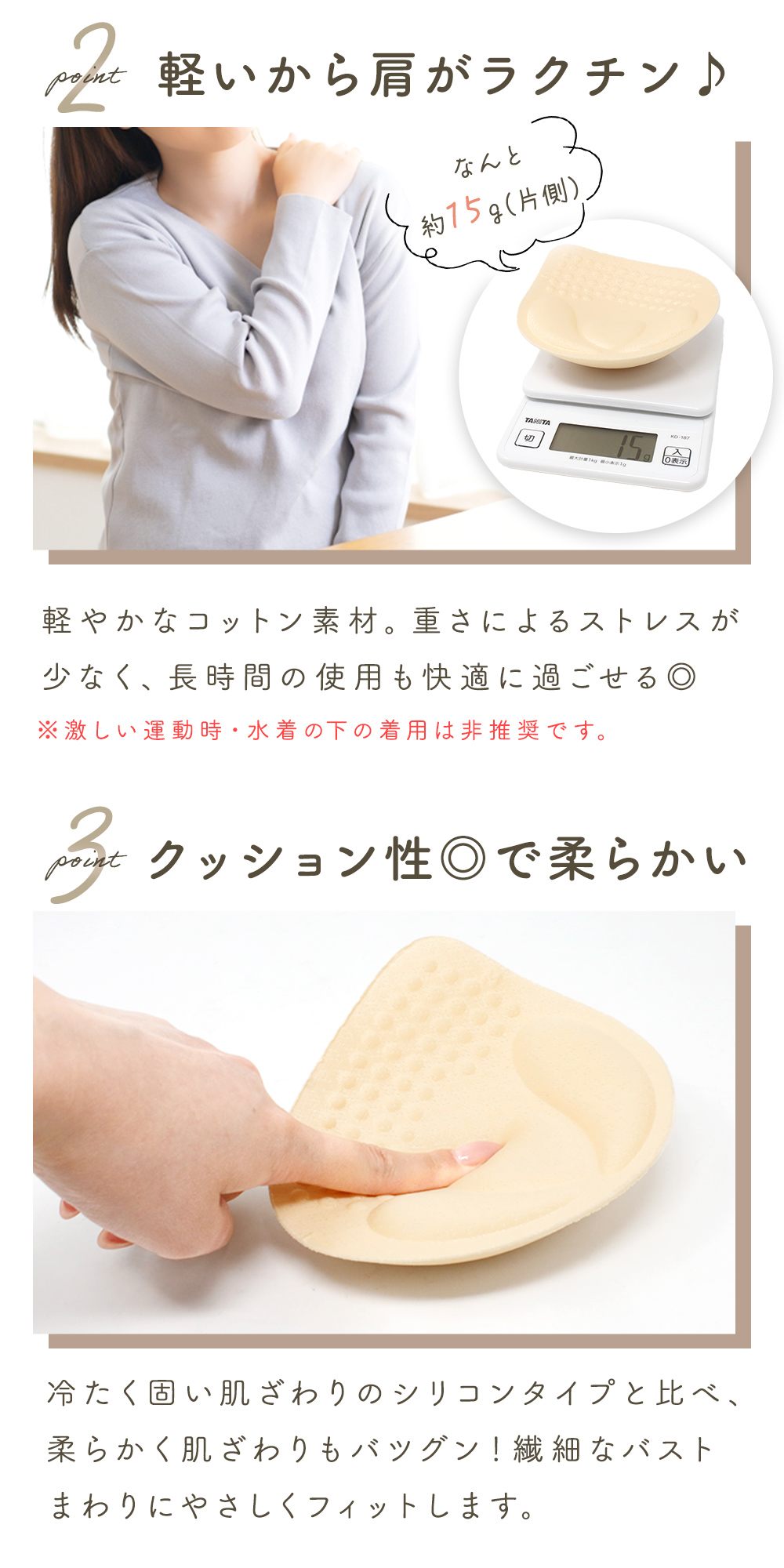 ・高いクッション性でやさしくフィットもちもちのクッションがバストにやさしくフィット。体に沿うような形状でズレにくく、安心感のある着け心地。