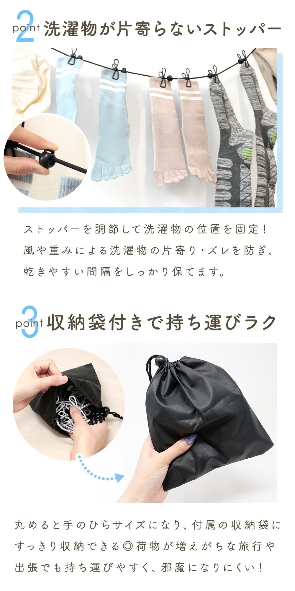 ・クリップ12個付きで小物干しに大活躍ロープにはクリップが12個固定されており、靴下やタオル、下着、ハンカチなどの小物をしっかりキャッチ。片寄りやズレを防止するストッパー機能付きで、安定して干せるため効率的に乾燥できます。ハンガー不要でそのまま掛けられるのも嬉しいポイントです。