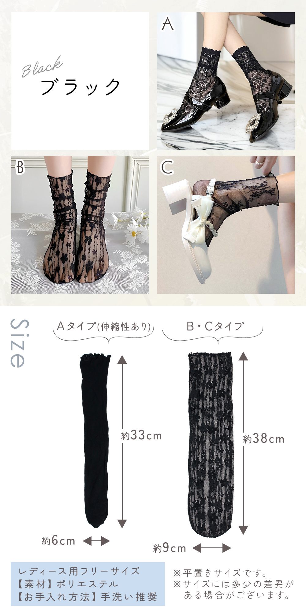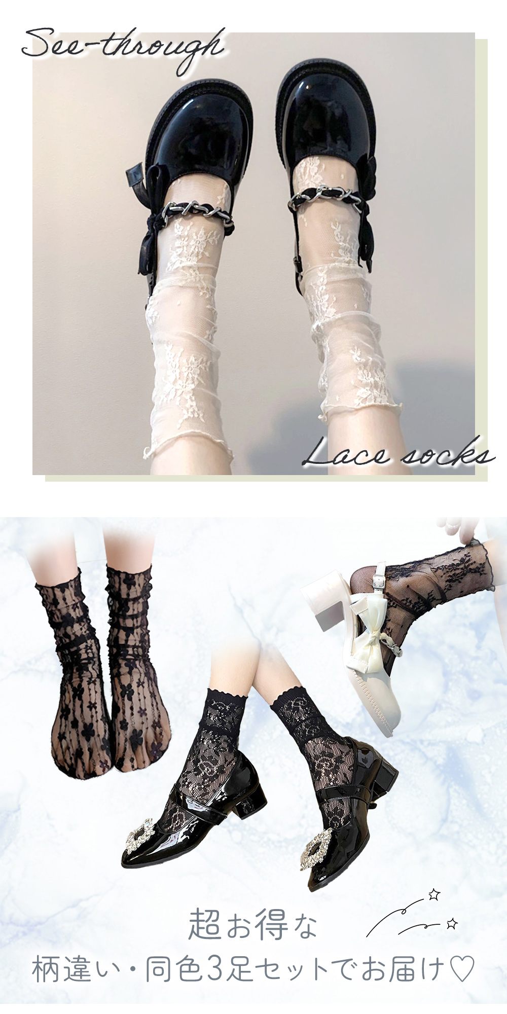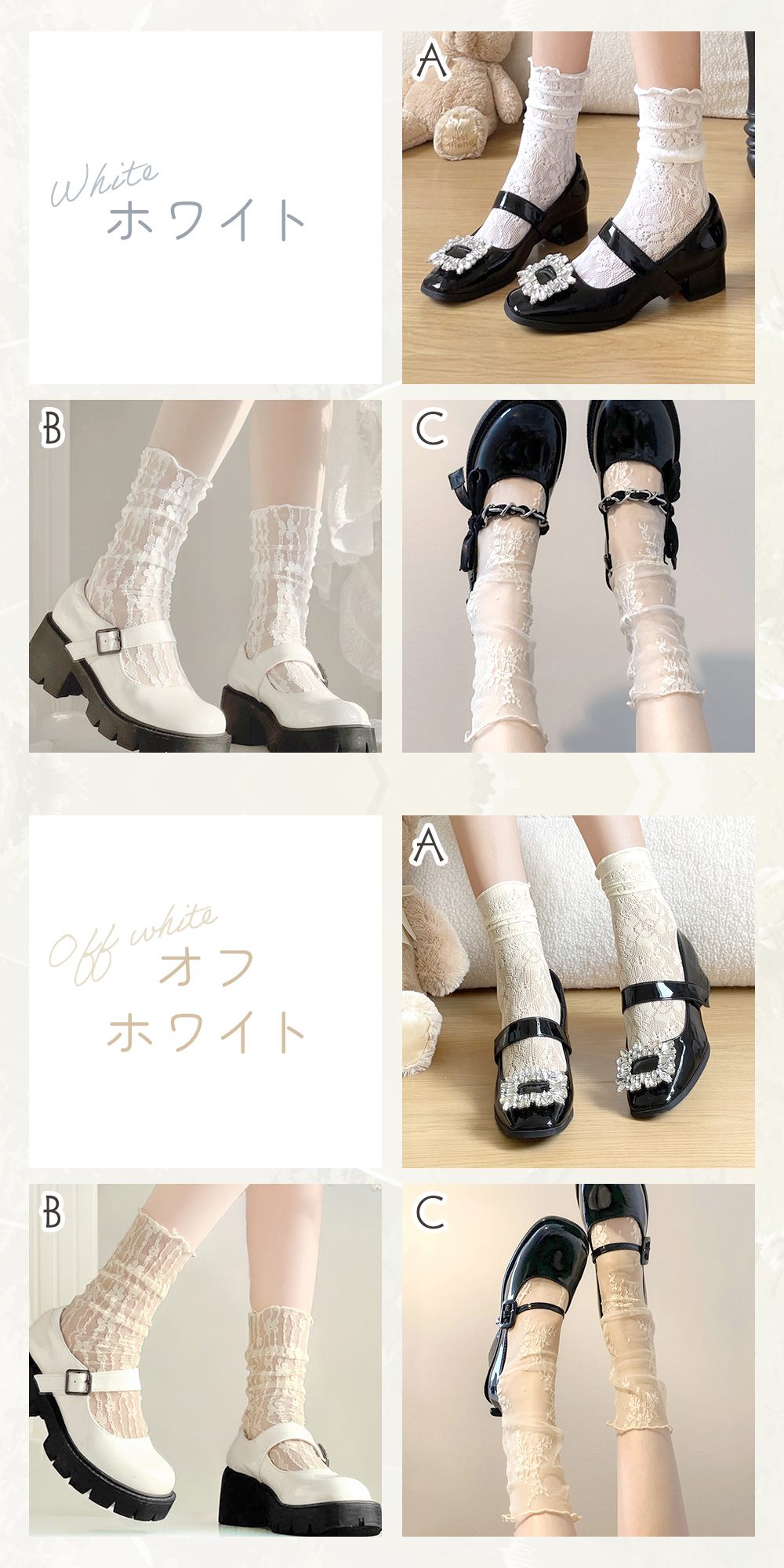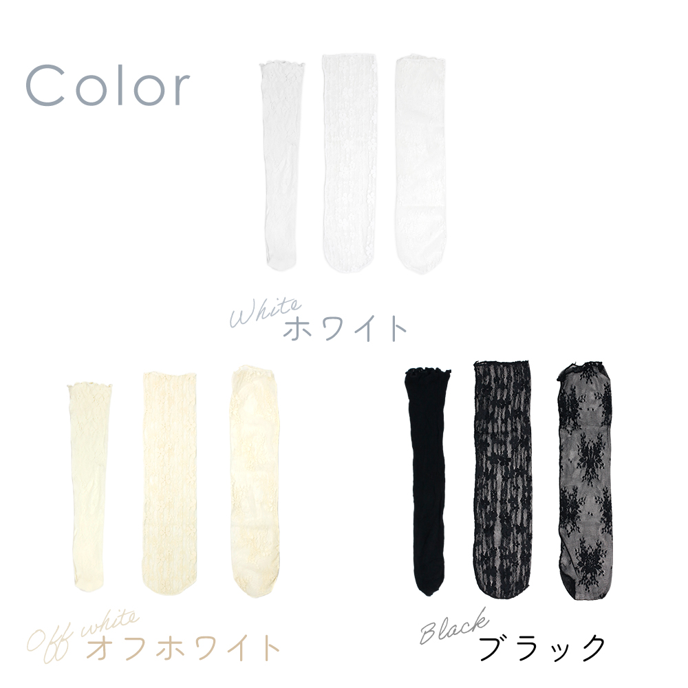 ・かわいくて大人可愛い柄レースソックスが持つかわいさと大人っぽさを両立したデザインで、年齢を問わず使えるアイテムです。
