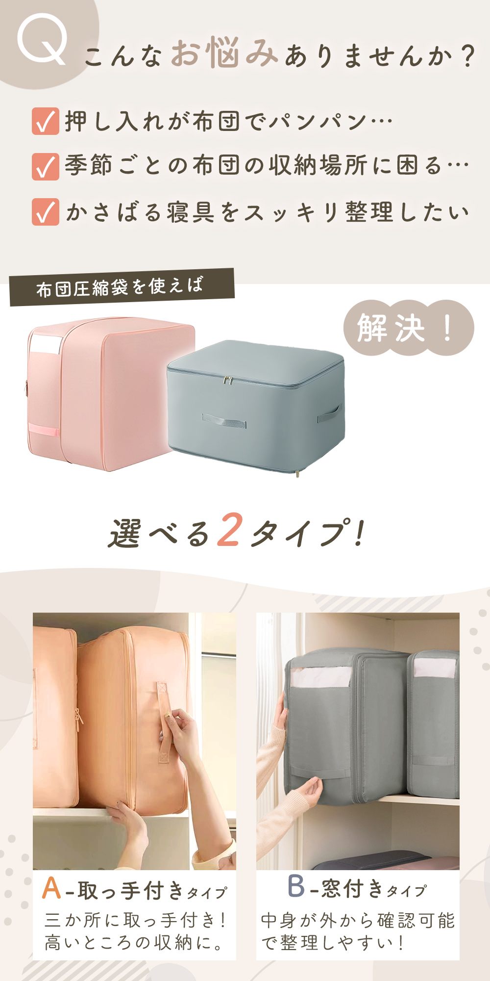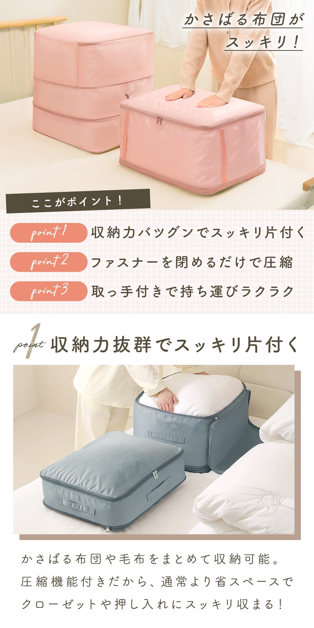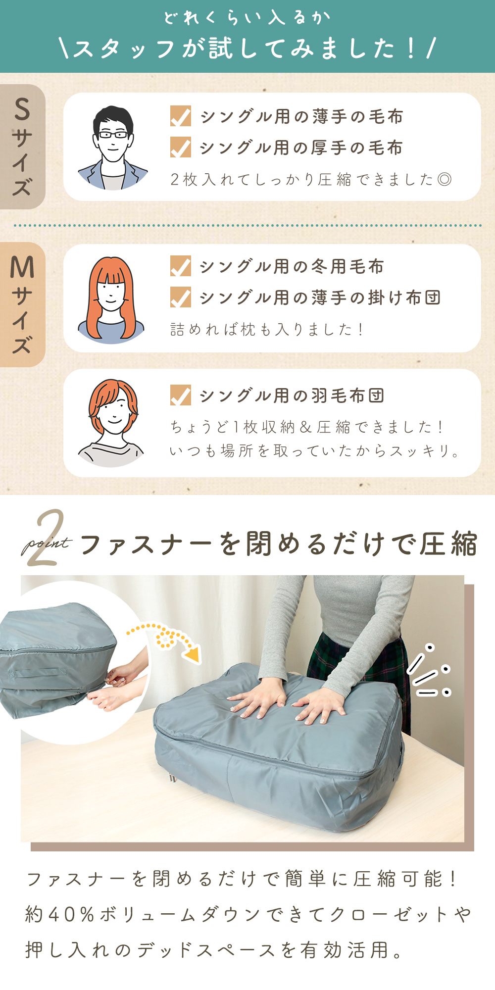・省スペースで賢く収納|掃除機不要の布団圧縮袋布団圧縮袋で、かさばる布団や羽毛布団を約40%ボリュームダウン。
