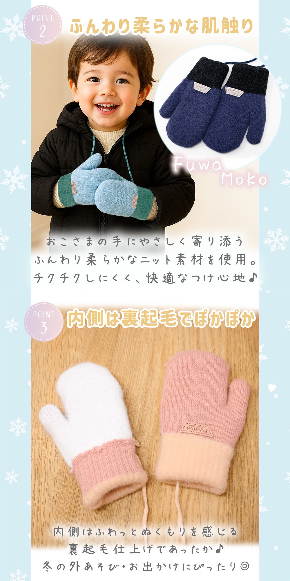 ・ぽかぽか保温力とやさしい着け心地ふわふわ裏起毛×厚手ニットで、冬の外あそびや通園でも手先まであったか。空気を含むやわらか素材でぽかぽか保温し、雪の日や風の強い日もほっこり暖かい防寒対策に。ベビーや子供のデリケートな手をやさしく包みます。