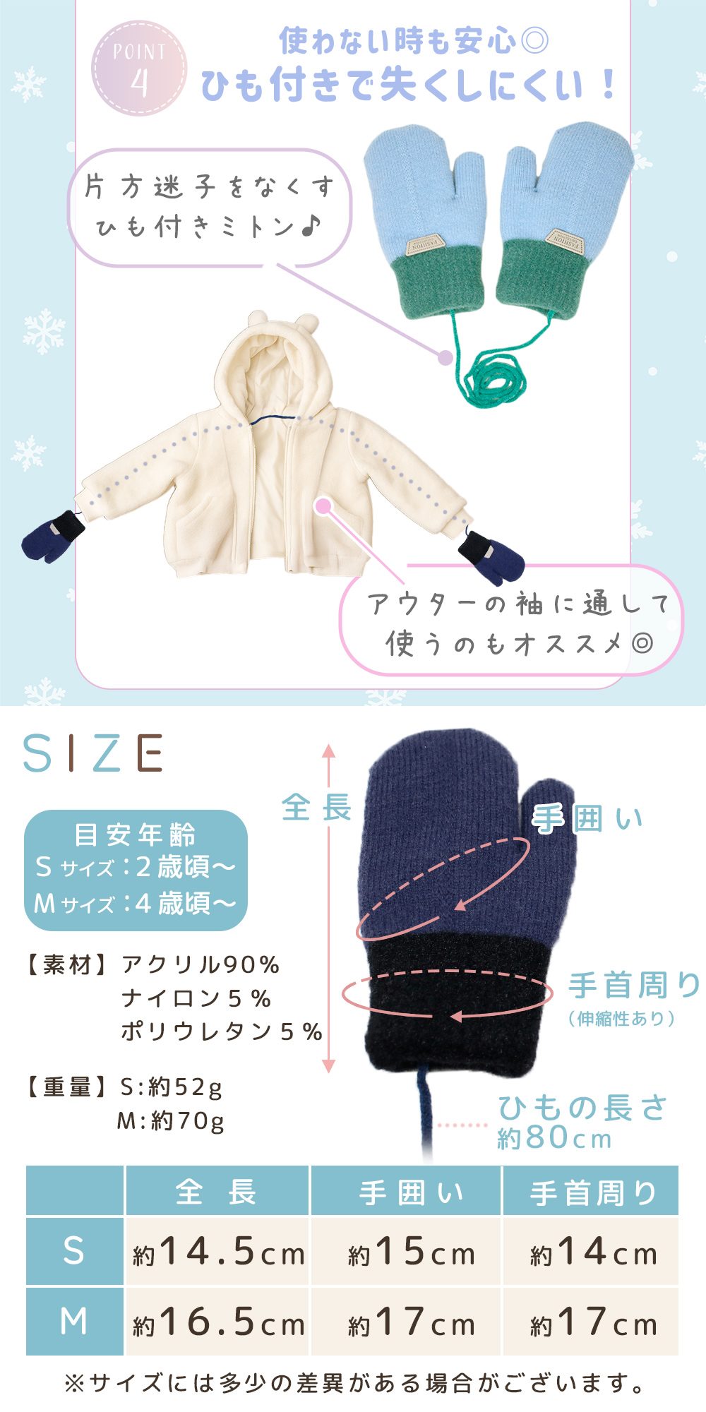 ・男女兼用のおしゃれバイカラー&2サイズ男の子・女の子どちらにも似合うバイカラー。S/Mの2サイズ展開で、Sは2?3歳目安、Mは3?4歳目安にフィット。ベビーからキッズまで成長に合わせて選べ、冬コーデのアクセントにも。