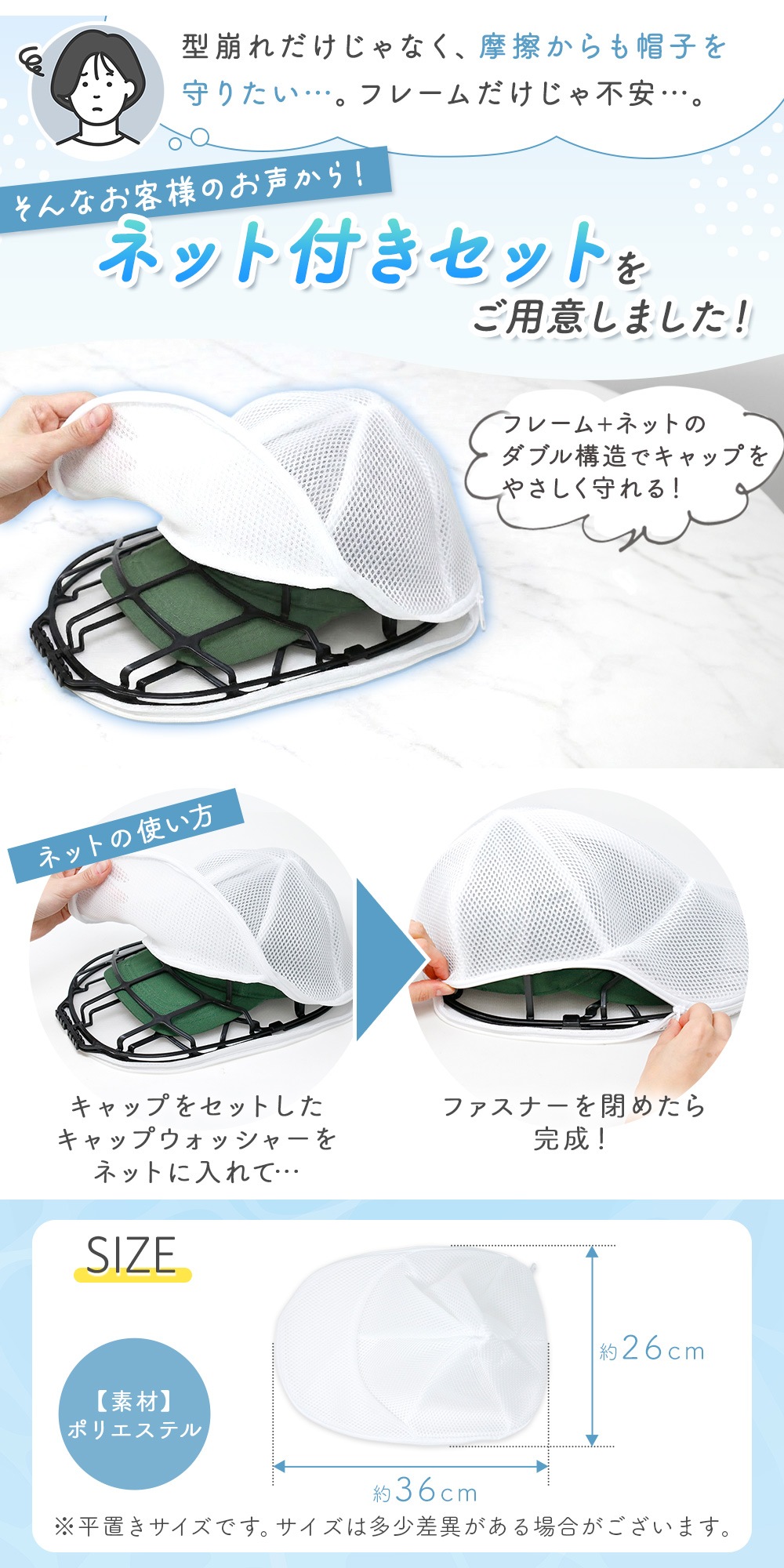 ・大切な帽子を優しく守る洗濯専用キャップウォッシャーお気に入りの帽子を洗濯機で簡単・安心して洗える帽子用の洗濯ネットです。