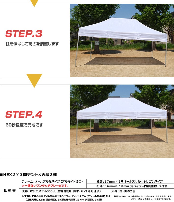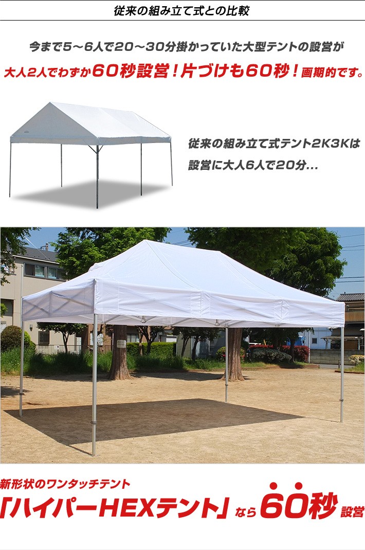 最強 ワンタッチテント HEX ハイパーテント 寄棟型 3.6m×5.4m (2間×3間) オールアルミフレーム テント 簡単
