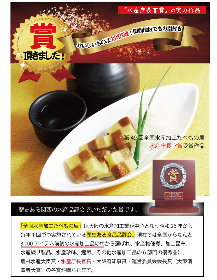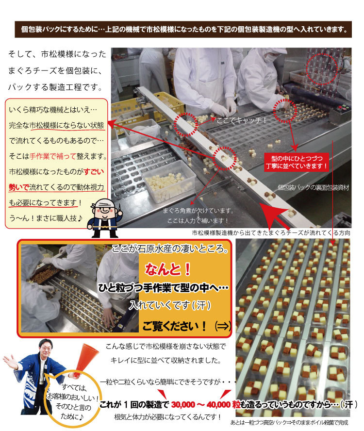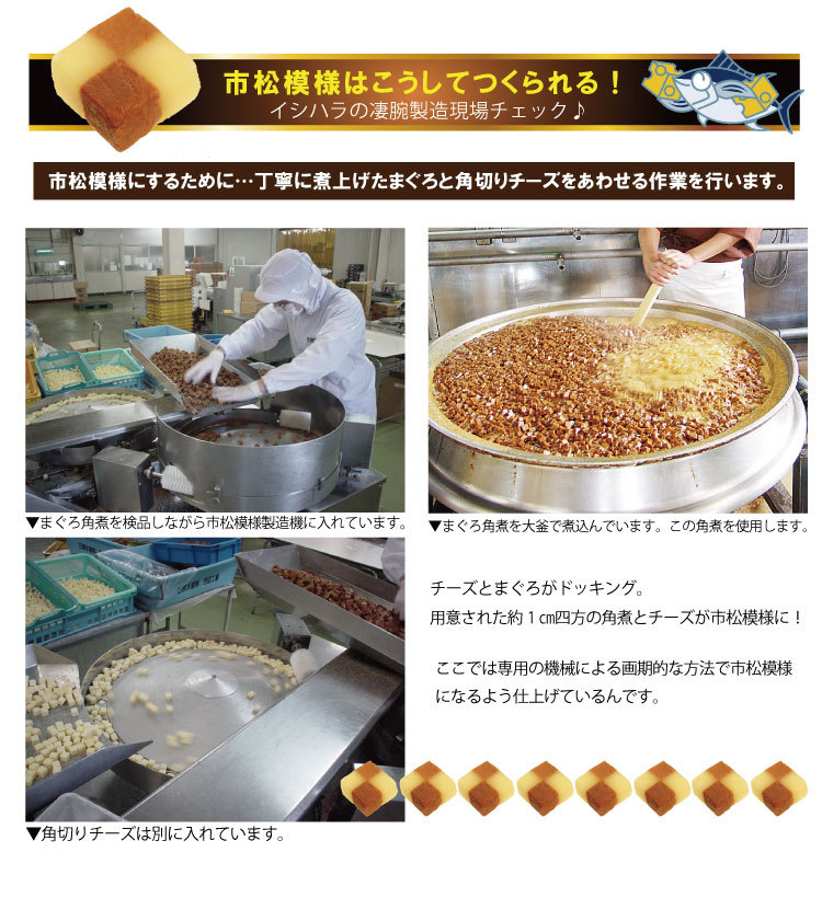| 原料 | 乳等を主原料とする食品(ナチュラルチーズ、還元水飴、植物油脂、ゼラチン)、まぐろ、砂糖、醤油、還元水飴、米発酵調味料、乳化剤(原材料の一部に小麦、大豆を含む) |