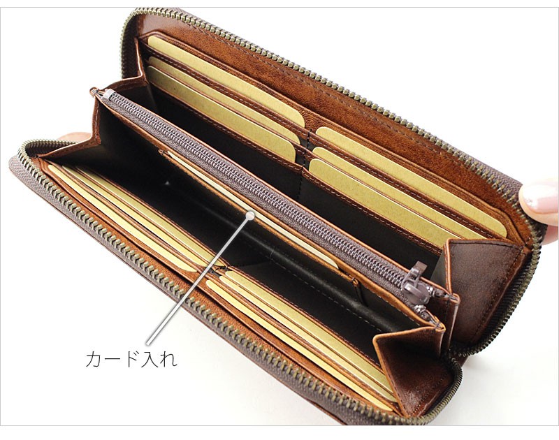 ファスナーでコの字型に大きく開き、カードも紙幣もコインも、たっぷりしまえて便利です。