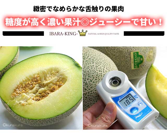 メロン生産量日本一を誇る茨城県のオリジナル品種で、400通り以上の交配から選び抜き、最上の一つを育成した新作メロン(2010年品種登録)です。“メロンの王様(キング)として茨城の顔になってほしい”と願いを込めて「イバラキング」と名付けられました。10年以上の歳月を掛け、満を持して登場した新作イバラキングは、食味の良さにおいて、同時期に出回るメロンの中でもトップクラスの評価を獲得しています。