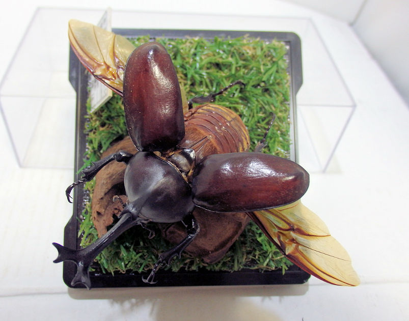 カブトムシ♂78mm (飛翔 標本) 学 名:Trypoxylus dichotomus〇飛翔標本のコンセプト・特徴ジオラマ標本は「生きているかのように今にも動き出すかのようなリアル感」をキャッチコピーに自然の中で生きていたときの昆虫達の一瞬を形にしています。