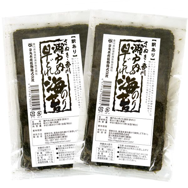 | ■商品内容: | 瀬戸内の早どれ海苔<訳あり> 半切14枚(板のり7枚分)×2袋 |