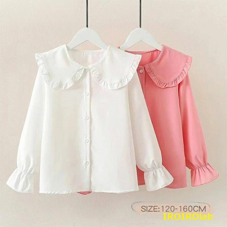 子供服 女の子 ブラウス 長袖 キッズ シャツ 白 ホワイト ピンク 丸衿 ジュニア シャツ フォーマル トップス フリル 白ブラウス 無地 結婚式