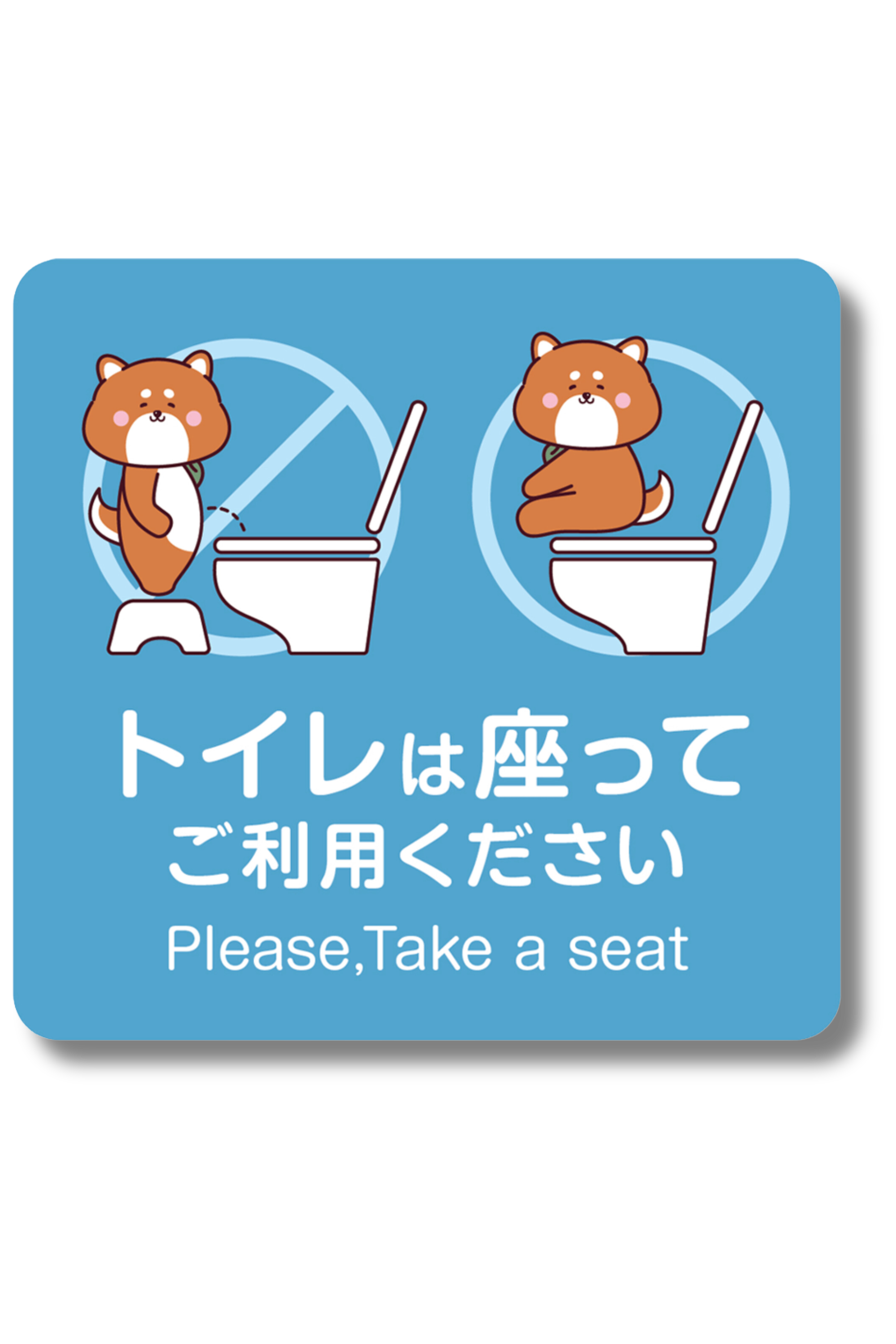 柴犬のかわいいデザインと「トイレは座ってご利用ください」という優しいメッセージで、来客者にマナーを伝えるおしゃれなアイテムです。