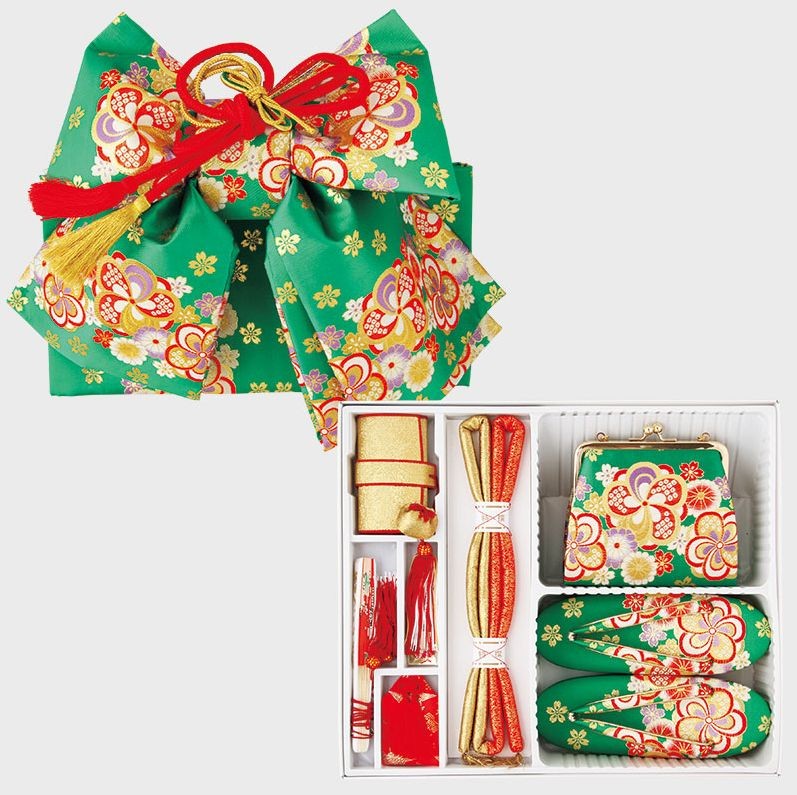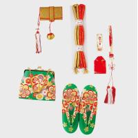 【 結び帯 はこせこペアーセット 】 七五三の七歳のお祝いに豪華な帯と箱せこセットはいかがですか? 着物を彩るのにかかせない小物類です。 草履やバッグなどがセットになっています。 箱せこセットとは、草履、バック、丸絎(まるぐけ)又は 帯締、末広(扇子) お守り、筥迫(はこせこ)がセットになったものをいいます。 ●内容と説明 [女児用結び帯] 素材 ポリエステル、ナイロンなど サイズ 大 [草履] サイズ L寸(21cm) [バッグ] [丸絎] 「まるぐけ」と言います。帯締の一種です。 丸い棒状になっており、芯に真綿が入っています。 七五三や花嫁衣装に用いられます。 [末広] 扇子のことです、縁起をかつぎ「すえひろ」と呼びます。 帯に挟みます。 [筥迫] 「はこせこ」と言います、箱迫とも書きます。 中にちり紙を入れ、衿の合わせ目、懐に少しはみ出させて携帯します。 江戸時代は武家の女性のたしなみであり、おしゃれのポイントでした。 今では七五三や花嫁衣装の装飾として残っています。 [お守り] ●なおこのセットには髪飾りが付属していません。 髪飾りもご希望の方は別途お求め下さい。 店在庫欠品の場合はメーカーよりお取り寄せ後の発送になります、 ご了承下さい |