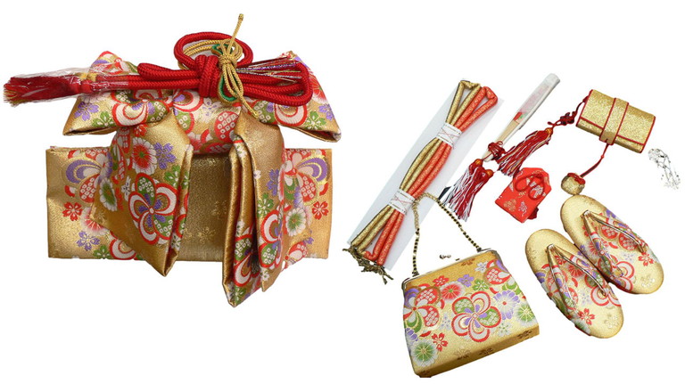 | 【 結び帯・はこせこセット 】 七五三の三歳のお祝いに豪華な箱せこセットはいかがですか? 着物を彩るのにかかせない小物類です。 草履やバッグなどがセットになっています。 箱せこセットとは、草履、バック、丸絎(まるぐけ)又は 帯締、末広(扇子) お守り、筥迫(はこせこ)がセットになったものをいいます。 ●内容と説明 [草履] サイズ S寸(16.5cm) [バッグ] [丸絎] 「まるぐけ」と言います。帯締の一種です。 丸い棒状になっており、芯に真綿が入っています。 七五三や花嫁衣装に用いられます。 [末広] 扇子のことです、縁起をかつぎ「すえひろ」と呼びます。 帯に挟みます。 [筥迫] 「はこせこ」と言います、箱迫とも書きます。 中にちり紙を入れ、衿の合わせ目、懐に少しはみ出させて携帯します。 江戸時代は武家の女性のたしなみであり、おしゃれのポイントでした。 今では七五三や花嫁衣装の装飾として残っています。 [お守り] |