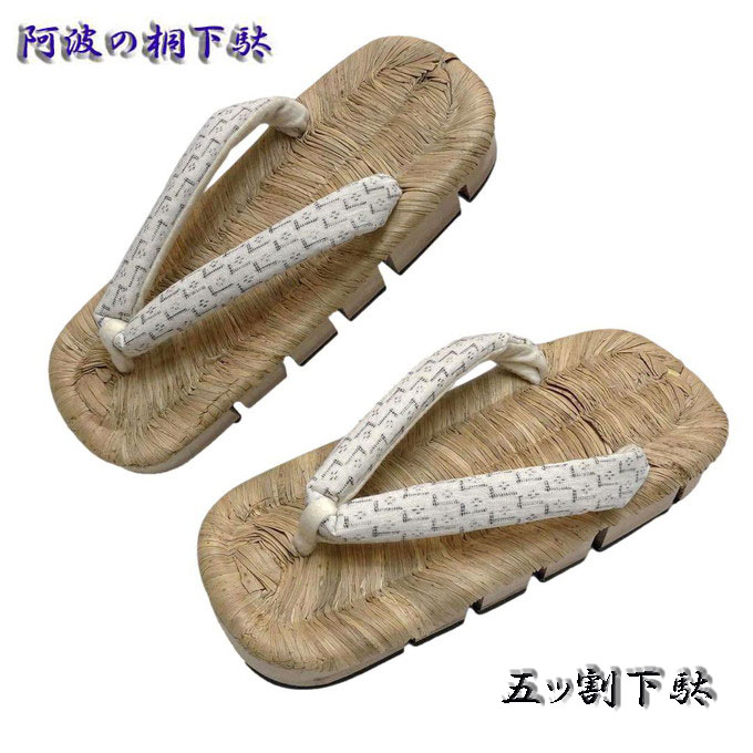 | 五ッ割下駄・白絣(綿麻)鼻緒・阿波の桐下駄・粋創楽舞きもの大岡オリジナル鼻緒、手作りの和装履物です。 |