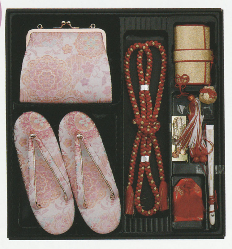 七五三の七歳のお祝いに豪華な帯と箱せこセット 着物を彩るのにかかせない小物類です。