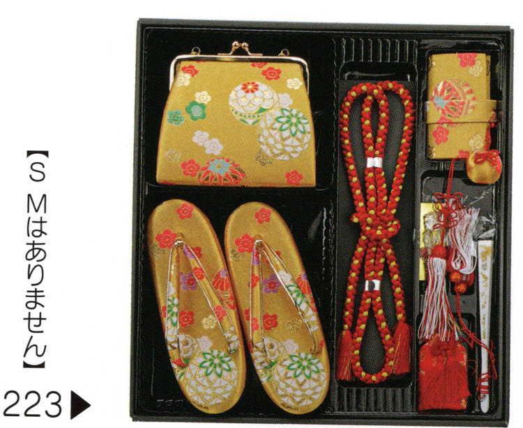 | 【 753の良き日に 祝はこせこセット 】 七五三のお祝いに豪華なセットはいかがですか? 祝着を彩るのにかかせない小物類です。 草履やバッグなどがセットになっています。 箱せこセットとは、草履、バック、丸絎(まるぐけ)又は 帯締、末広(扇子) お守り、筥迫(はこせこ)がセットになったものをいいます。 ●内容と説明 [草履] サイズ L寸(21.0cm)7歳用 [バッグ] [丸絎] 「まるぐけ」と言います。帯締の一種です。 丸い棒状になっており、芯に真綿が入っています。 七五三や花嫁衣装に用いられます。 [末広] 扇子のことです、縁起をかつぎ「すえひろ」と呼びます。 帯に挟みます。 [筥迫] 「はこせこ」と言います、箱迫とも書きます。 中にちり紙を入れ、衿の合わせ目、懐に少しはみ出させて携帯します。 江戸時代は武家の女性のたしなみであり、おしゃれのポイントでした。 今では七五三や花嫁衣装の装飾として残っています。 [お守り] ●なおこのセットには髪飾り・結び帯が付属していません。 ご希望の方は別途お求め下さい。 メーカーよりお取り寄せ後の発送になります、 ご了承下さい。 |