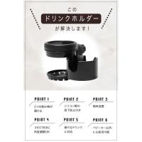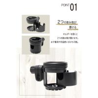 POINT12つの飲み物が置けるホルダーを開くと2つの飲み物が置けます。お子様用や冷温使い分けも可能。POINT2滑り止め付きの安心設計ホルダーの内側にシリコン製の滑り止めが付いておりガタガタ道でもボトルが飛び出しにくい安心設計です。POINT3ラクラク簡単設置つまみを緩めてクリップで挟むだけなので、簡単に取り付け可能です。場所を選ばず、しっかり固定します。POINT4360°角度調整OK回転式で角度調節可能なので、様々な角度の位置に取り付け可能です。