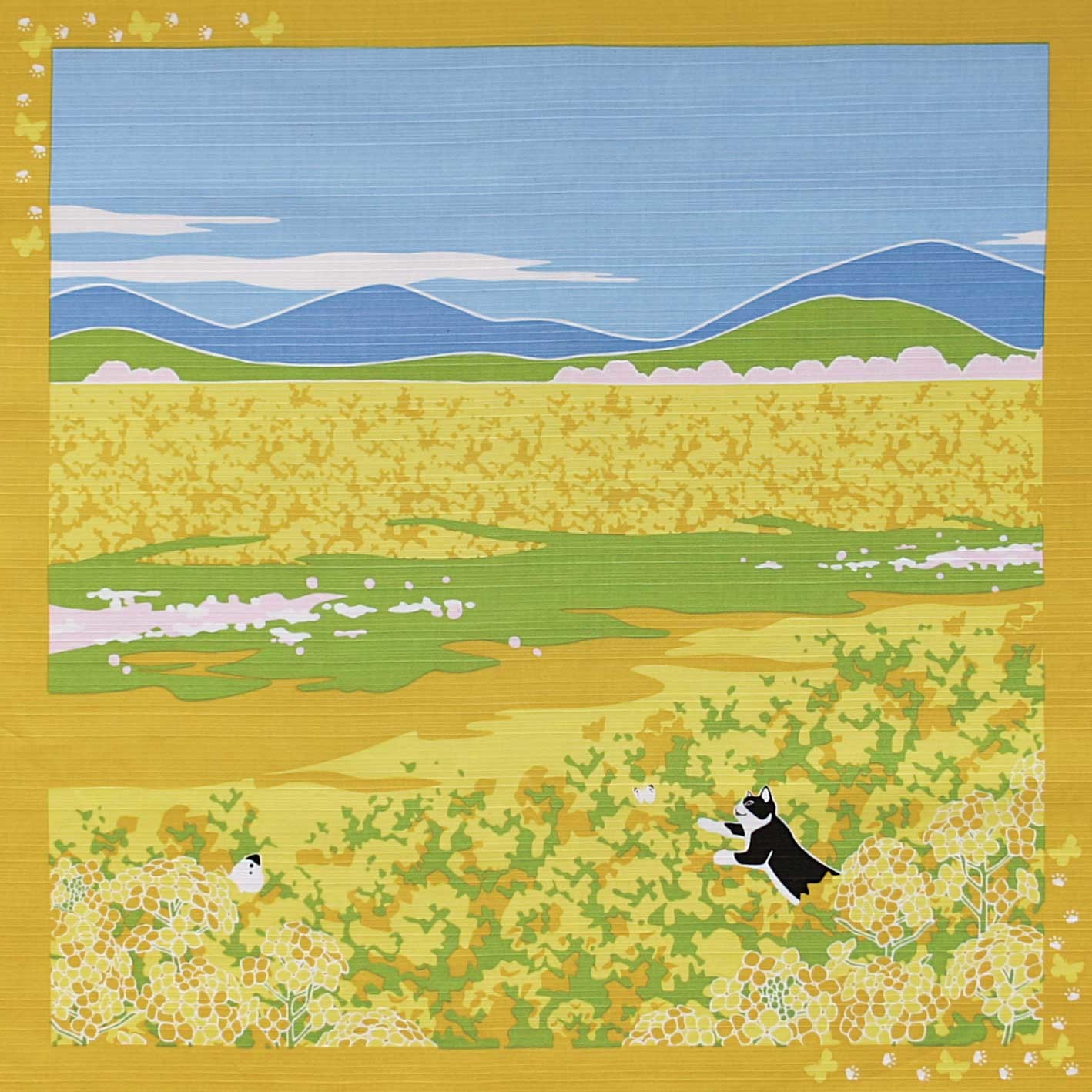 前田染工 たまのお散歩 菜の花(3月) Rape blossoms 日本製 季節の小風呂敷 型友禅 和柄 四季 ハンカチ タペストリー ランチクロス ハチワレ 白黒猫 おしゃれ