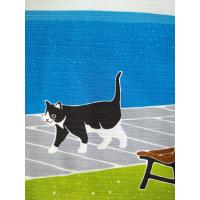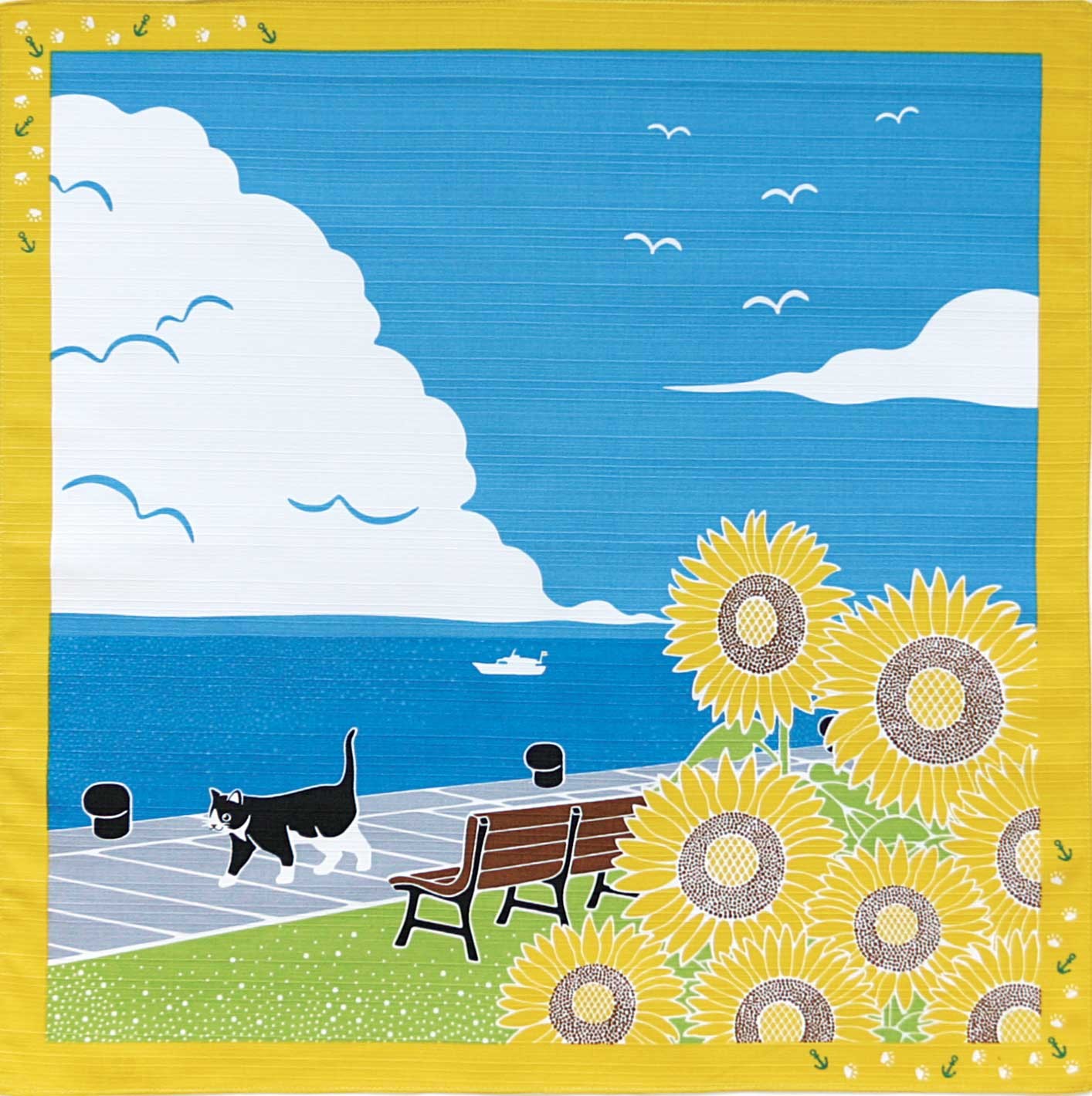 前田染工 たまのお散歩 向日葵(8月)ひまわり Sunflower 日本製 季節の小風呂敷 型友禅 和柄 四季 ハンカチ タペストリー ランチクロス ハチワレ 白黒猫