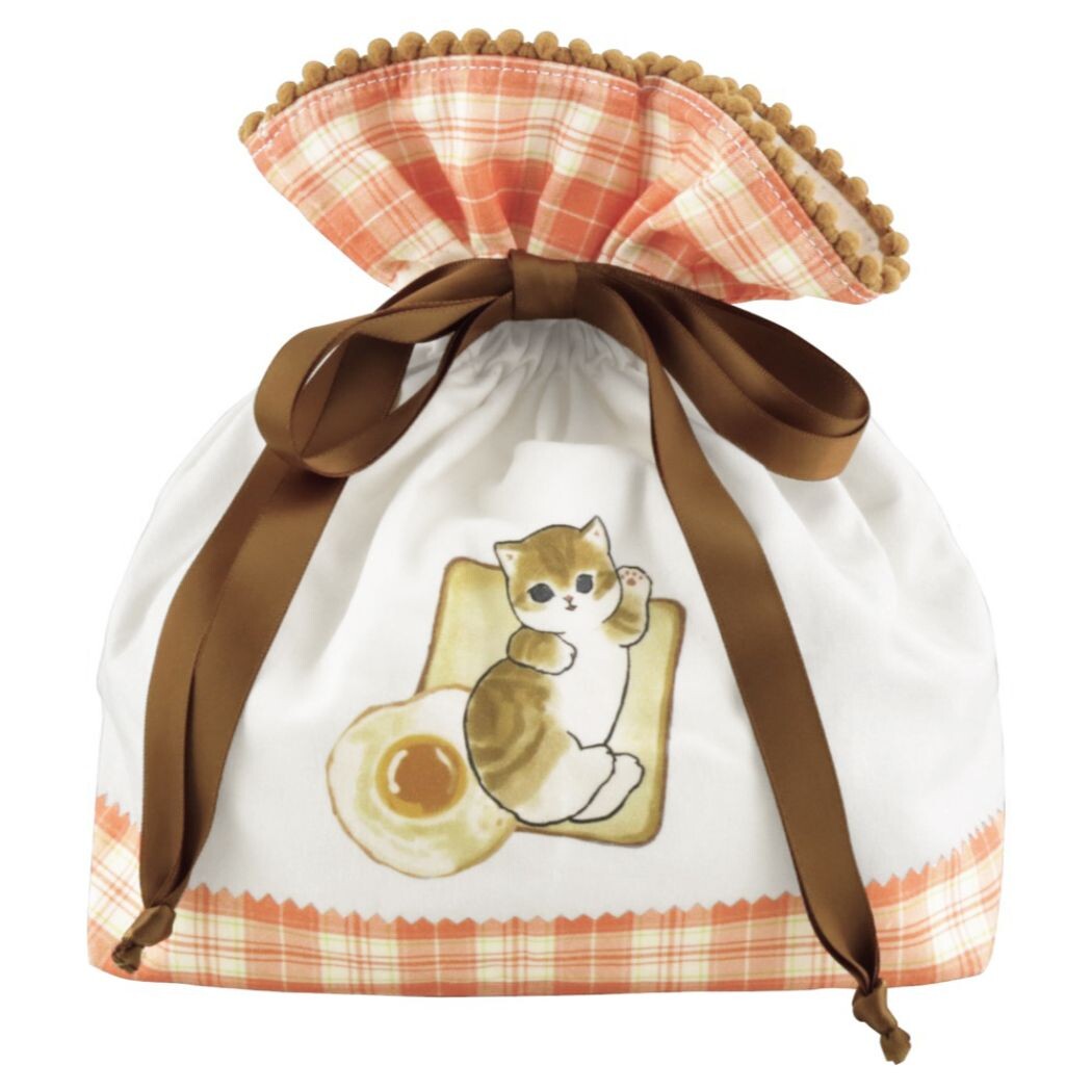モフサンドの可愛い巾着。きゅっと絞ってリボンにして、可愛くバッグに収納できちゃいます。SNSで大人気、猫愛あふれでる「もふもふ」な猫のイラストを生みだす作家「ぢゅの」デザイン。ギフトなどにも喜ばれそう。