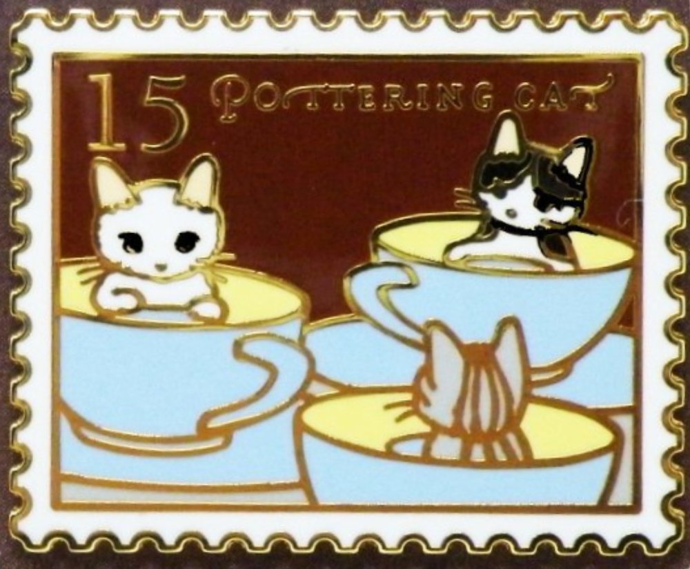 ポタリングキャット ピンズ コーヒーカップ ピンバッジ ピンブローチ グッズ 猫雑貨 ギフト かわいい 白猫 ハチワレ 切手デザイン