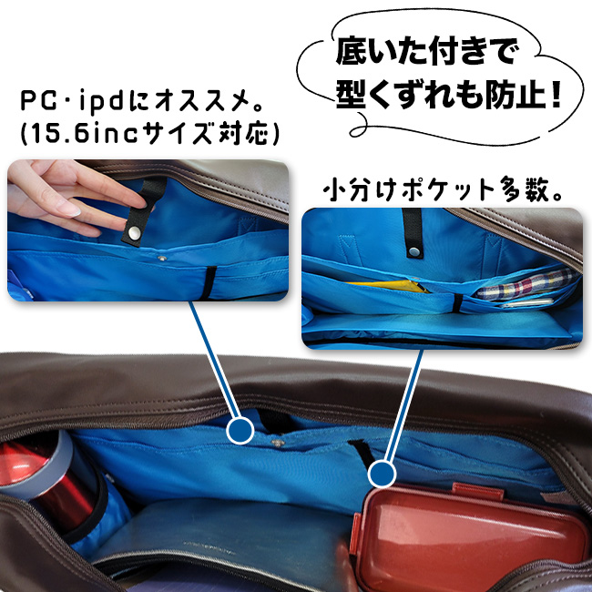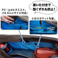 内側:収納(底板入り)+ドリンクホルダー×1/フリーポケ×3/スナップボタン式ポケット×1(PC15.6inc対応サイズ)
