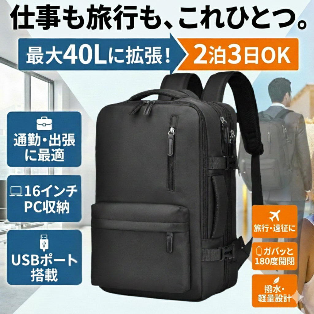 ・薄型ながら拡張機能付きで、荷物が増えても安心の大容量を実現。普段使いから出張や旅行にも対応可能です。