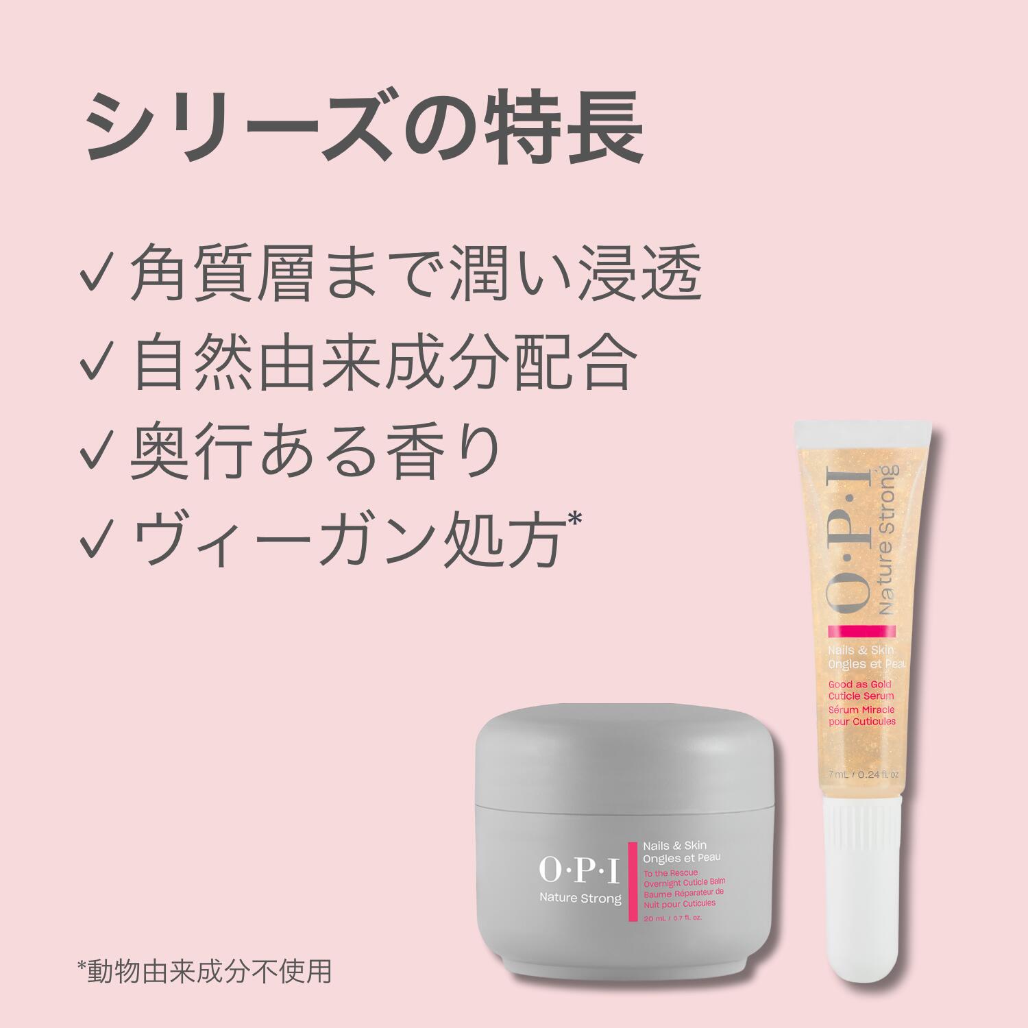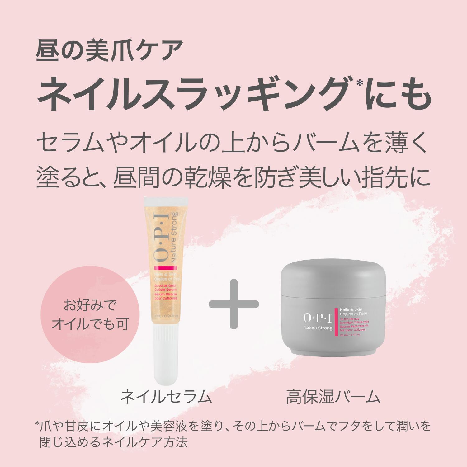 | 【商品名】 ネイチャーストロング ネイル&スキンケア シリーズ ネイルセラム、ネイルバーム 2点セット NSSC002 NSキューティクル セラム NSSC001 NSキューティクル バーム 【商品説明】 ネイルセラム、ネイルバーム 2点セット (1) キューティクル セラム:ジェルで角質層まで浸透、高保湿ネイル美容液 ●角質層まで潤い浸透 さらっと軽い付け心地でべたつかないから、シーンを選ばず使えます。ネイルオイルよりさらに軽い付け心地。 ●金色ラメ入りの高保湿ネイル美容液 金色ラメ入りで輝く華やかな手元に。自然由来成分 91%(*1)。保湿成分グリセリンをリッチに配合。ヴィーガン処方(*2)。 *1 自然由来指数91%(水71%含む)ISO 16128 準拠、*2 動物由来成分不使用 ●奥行きある香り体験 シトラスやフルーティなトップノートから始まり、ピオニーやリリーの華やかなミドルノートへ。ラストテストはアンバーやウッディ、ムスクがやわらかく残ります。調香師が設計した香りで、セルフケアをより心地よく楽しめます。MoodBloom Scent Technology(TM)採用。 ●持ち運べるペンタイプ 24時間、どこでも指先ケアできます。シリコンマッサージャーが甘皮をやさしくケア。ご使用時は適量を取り、爪とキューティクル周りにマッサージするように馴染ませます。 ●昼の美爪ケア、ネイルスラッギング*にも ネイルセラムやネイルオイルの上からネイルバームを薄く塗ると、昼間の乾燥を防ぎ美しい指先に。 *爪や甘皮にオイルや美容液を塗り、その上からバームでフタをして潤いを閉じ込めるネイルケア方法。 (2) キューティクル バーム:夜の集中ケアに、高保湿ネイルバーム ●角質層まで潤い浸透 濃厚なのに軽やかな使い心地。肌になじませることで、固形のバターがオイルへと変化。睡眠中に保湿し、キューティクルをなめらかに整えます。 ●濃密ケアに 高保湿のシアバター(*1)と植物オイル(*2)をリッチに配合。爪、甘皮、肌の水分を閉じ込め、しっかり保湿します。自然由来成分 95%(*3)、ヴィーガン処方(*4) 。 *1 シア脂エキス(皮膚コンディショニング剤)、*2 ヒマワリ種子油、ホホバ種子油(皮膚コンディショニング剤)、*3 自然由来指数95%(水を含まない)ISO 16128 準拠、*4 動物由来成分不使用 ●奥行きある香り体験 シトラスやフルーティなトップノートから始まり、ピオニーやリリーの華やかなミドルノートへ。ラストテストはアンバーやウッディ、ムスクがやわらかく残ります。調香師が設計した香りで、セルフケアをより心地よく楽しめます。MoodBloom Scent Technology(TM)採用。 ●のびがよく、少量でしっかり潤う 適量を取り、爪とキューティクル周りにマッサージするように馴染ませます。昼のケアは薄く塗って乾燥対策、約400回分*(米粒大を両手に使用した場合)。夜はこっくり重ねて集中ケア、約80回分*(パール大を両手に使用した場合)。 *標準的な目安使用量。個人差あります。 ●昼の集中ケア、ネイルスラッギング*に ネイルセラムやネイルオイルの上からネイルバームを薄く塗ると、昼間の乾燥を防ぎ美しい指先に。 *爪や甘皮に美容液やオイルを塗り、その上からバームでフタをして潤いを閉じ込めるネイルケア方法 【品番・内容量】 NSSC002 NSキューティクル セラム 7mL (チューブタイプ) NSSC001 NSキューティクル バーム 20mL (ジャータイプ) 【原産国】 NSSC002 NSキューティクル セラム:ポーランド NSSC001 NSキューティクル バーム:イタリア 【使用方法】 NSSC002 NSキューティクル セラム: 適量を爪とキューティクル周りに塗布し、マッサージするように馴染ませます。チューブを強く押すと中身が勢いよく出ることがあります。軽く押してご使用ください。 NSSC001 NSキューティクル バーム: 適量を取り、爪とキューティクル周りにマッサージするように馴染ませます。昼のケアは薄く塗って乾燥対策、約400回分*(米粒大を両手に使用した場合)。夜はこっくり重ねて集中ケア、約80回分*(パール大を両手に使用した場合) 。 *標準的な目安使用量。個人差あります。 昼の美爪ケア、ネイルスラッギング*に。 昼はセラムやオイルの上からバームを薄く塗って乾燥対策。 *爪や甘皮にオイルや美容液を塗り、その上からバームでフタをして潤いを閉じ込めるネイルケア方法。 【原材料・成分】 NSSC002 NSキューティクル セラム: 水、グリセリン、ペンチレングリコール、PEG−40水添ヒマシ油、メチルプロパンジオール、プロパンジオール、香料、キサンタンガム、クエン酸Na、カプリリルグリコール、ジサクシノイルシスチン4Na、尿素、フェニルプロパノール、クエン酸、BG、ホウケイ酸(Ca/Al)、リン酸2Na、サッカロミセス/銅培養物、サッカロミセス/鉄培養物、サッカロミセス/Mg培養物、サッカロミセス/ケイ素培養物、サッカロミセス/亜鉛培養物、ビオチン、酸化チタン、レウコノストック/ダイコン根発酵液、シリカ、パンテノール、PG、酸化鉄、ペルベチアカナリクラタエキス、酸化スズ、ラミナリアディギタータエキス、橙205 NSSC001 NSキューティクル バーム: ヒマワリ