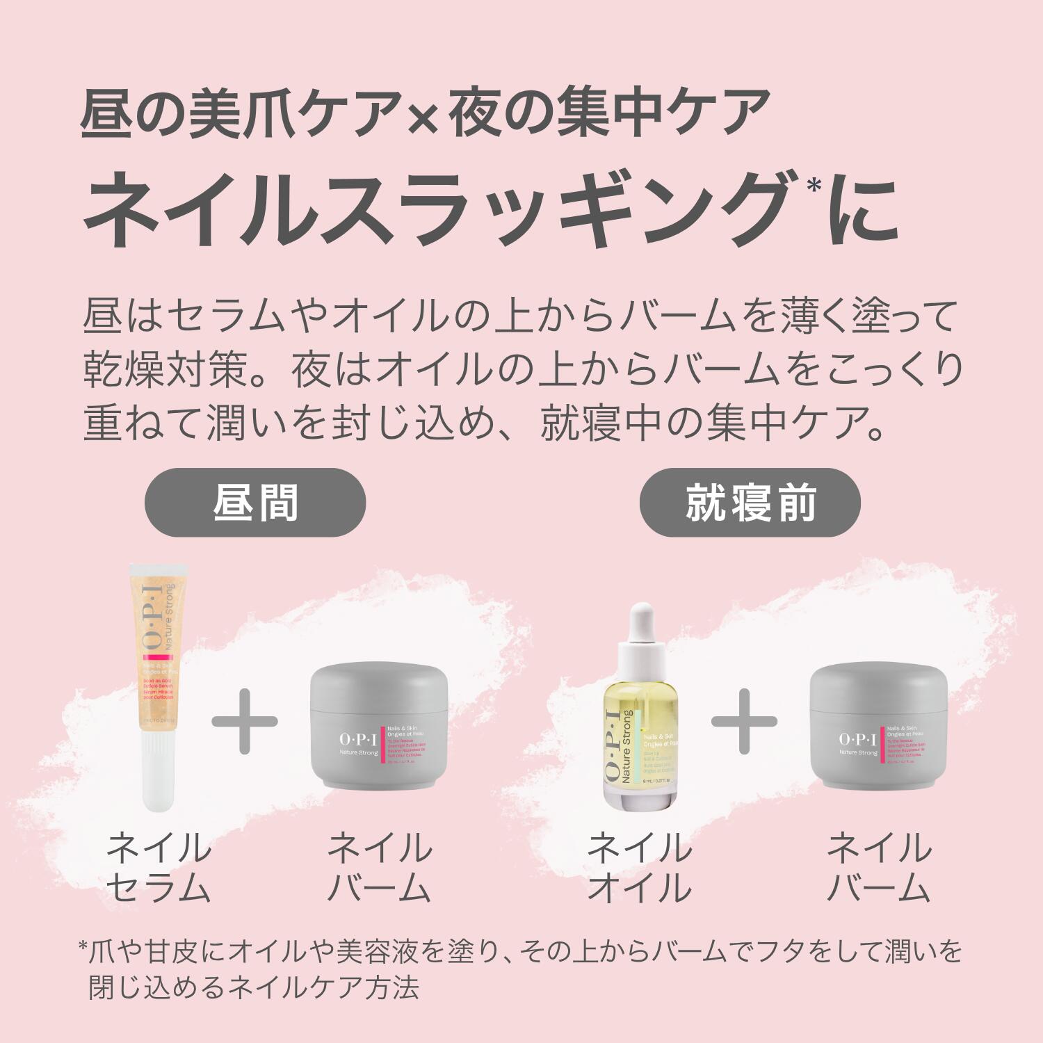 | 【商品名】 ネイチャーストロング ネイル&スキンケア シリーズ ネイルセラム、ネイルオイル 2点セット NSSC002 NSキューティクル セラム NSSC003 NSネイル&キューティクル オイル 【商品説明】 ネイルセラム、ネイルオイル 2点セット (1) キューティクル セラム:ジェルで浸透*、高保湿ネイル美容液 ●角質層まで潤い浸透 さらっと軽い付け心地でべたつかないから、シーンを選ばず使えます。ネイルオイルよりさらに軽い付け心地。 ●金色ラメ入りの高保湿ネイル美容液 金色ラメ入りで輝く華やかな手元に。自然由来成分 91%(*1)。保湿成分グリセリンをリッチに配合。ヴィーガン処方(*2)。 *1 自然由来指数91%(水71%含む)ISO 16128 準拠、*2 動物由来成分不使用 ●奥行きある香り体験 シトラスやフルーティなトップノートから始まり、ピオニーやリリーの華やかなミドルノートへ。ラストテストはアンバーやウッディ、ムスクがやわらかく残ります。調香師が設計した香りで、セルフケアをより心地よく楽しめます。MoodBloom Scent Technology(TM)採用。 ●持ち運べるペンタイプ 24時間、どこでも指先ケアできます。シリコンマッサージャーが甘皮をやさしくケア。ご使用時は適量を取り、爪とキューティクル周りにマッサージするように馴染ませます。 ●昼の美爪ケア、ネイルスラッギング*にも ネイルセラムやネイルオイルの上からネイルバームを薄く塗ると、昼間の乾燥を防ぎ美しい指先に。 *爪や甘皮にオイルや美容液を塗り、その上からバームでフタをして潤いを閉じ込めるネイルケア方法。 (2) ネイル&キューティクル オイル:うるおい守る、指先美人のネイルオイル ●角質層まで潤い浸透 さらっと軽い付け心地でべたつかないから、シーンを選ばず使えます。 ●肌にうれしい成分 ビタミンE(*1)と5種の植物オイル(*2)配合。自然由来成分 94%(*3)、ヴィーガン処方(*4) 。 *1 酢酸トコフェロール、トコフェロール、*2 マカデミア種子油、ヒマワリ種子油、バオバブ種子油、アルガニアスピノサ核油、ブドウ種子油、*3 自然由来指数94%(水を含まない)ISO 16128 準拠、*4 動物由来成分不使用 ●奥行きある香り体験 シトラスやフルーティなトップノートから始まり、ピオニーやリリーの華やかなミドルノートへ。ラストテストはアンバーやウッディ、ムスクがやわらかく残ります。調香師が設計した香りで、セルフケアをより心地よく楽しめます。MoodBloom Scent Technology(TM)採用。 ●少量で潤うのでコスパ◎* 適量を取り、爪とキューティクル周りにマッサージするように馴染ませます。のびがよく、スポイトタイプなら1〜2滴で5本の指に使用可能。目安使用回数(両手)は、NSSC003(8mL)で約57回分*。 *従来品のプロスパ ネイル&キューティクルオイルの約半分量で使用可能。標準的な目安使用量。個人差があります。 ●夜の集中ケア、ネイルスラッギング*にも 就寝前にネイルオイルの上からネイルバームをこっくり重ね、潤いを閉じ込めることで、翌朝しっとりした美しい指先に。 *爪や甘皮にオイルや美容液を塗り、その上からバームでフタをして潤いを閉じ込めるネイルケア方法。 【品番・内容量】 NSSC002 NSキューティクル セラム 7mL (チューブタイプ) NSSC003 NSネイル&キューティクル オイル 8mL (スポイトタイプ) 【原産国】 ポーランド 【使用方法】 NSSC002 NSキューティクル セラム: 適量を爪とキューティクル周りに塗布し、マッサージするように馴染ませます。チューブを強く押すと中身が勢いよく出ることがあります。軽く押してご使用ください。 昼の美爪ケア、ネイルスラッギング*にも。 ネイルセラムやネイルオイルの上からネイルバームを薄く塗ると、昼間の乾燥を防ぎ美しい指先に。 *爪や甘皮にオイルや美容液を塗り、その上からバームでフタをして潤いを閉じ込めるネイルケア方法。 NSSC003 NSネイル&キューティクル オイル: 適量を取り、爪とキューティクル周りにマッサージするように馴染ませます。のびがよく、少量でしっかり潤います(スポイトタイプの場合、1、2滴で5指に使えます)。 夜の集中ケア、ネイルスラッギング*にも。 就寝前にネイルオイルの上からネイルバームをこっくり重ね、潤いを閉じ込めることで、翌朝しっとりした美しい指先に。 *爪や甘皮にオイルや美容液を塗り、その上からバームでフタをして潤いを閉じ込めるネイルケア方法。 【原材料・成分】 NSSC002 NSキューティクル セラム: 水、グリセリン、ペンチレングリコール、PEG−40水添ヒマシ油、メチルプロパンジオール、プロパンジオール、香料、キサンタンガム、クエン酸Na、カプリリルグリコール、ジサクシノイルシスチン4Na、尿素、フェニルプロパノール、クエン酸、BG、ホウケイ酸(Ca/Al)、リン酸2Na、サッカロミセス/銅培養物、サッカロミセス/鉄培養物、サッカロミセス/Mg培養物、サッカロミセス/ケイ素培養物、サッカロミセス/亜鉛培養物、ビオチン、酸化チタン、レウコノストック/ダイコン根発酵液、シリカ、パンテノール、PG、酸化鉄、ペルベチアカナリクラ