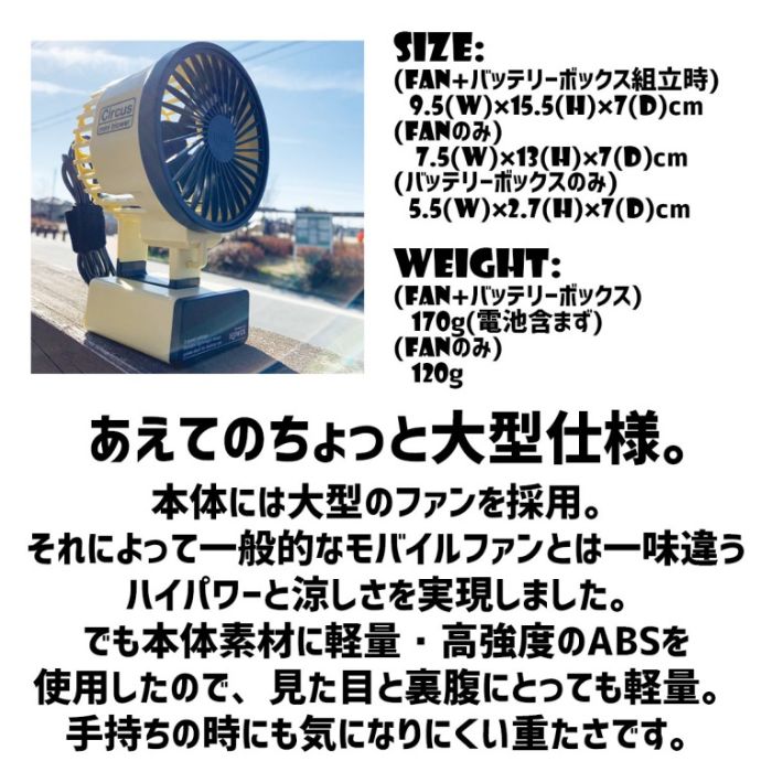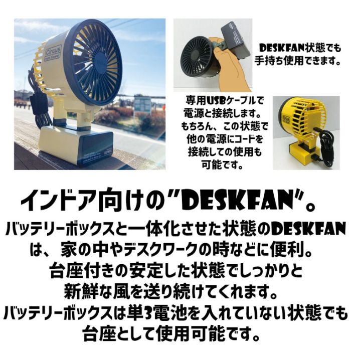 本体はファンのみ・ファンと電池ボックス兼台座をセットしての2タイプで使用が可能です。