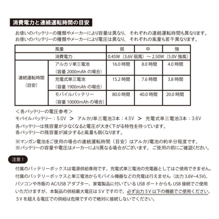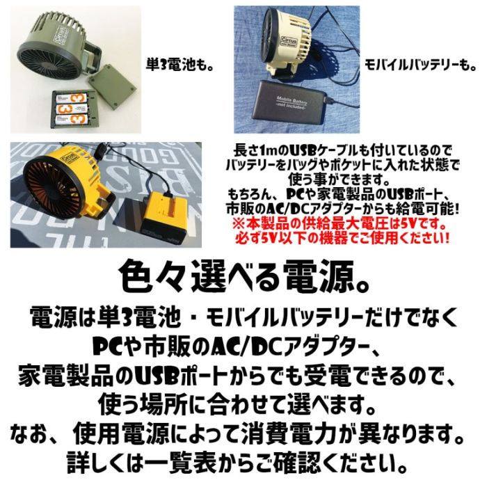 電源方式は『単3電池』『モバイルバッテリー』『USB接続』の3種類。