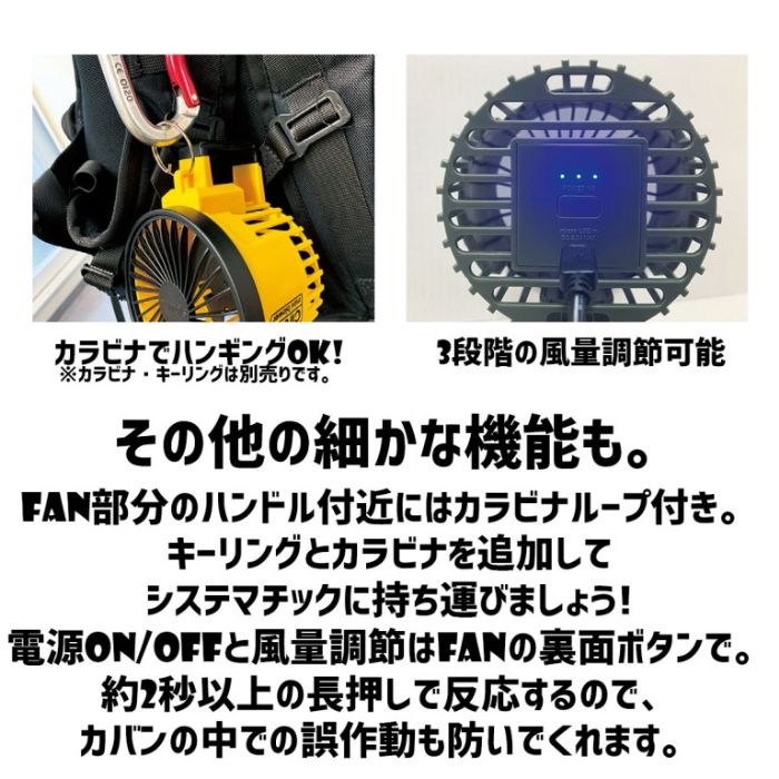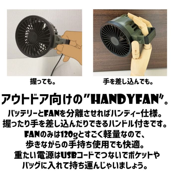 バッテリーはバッグやポケットに入れた状態でファンだけをもって使用できるので、徒歩での移動時やアウトドアなどでも重さを気にせずに使う事ができます。