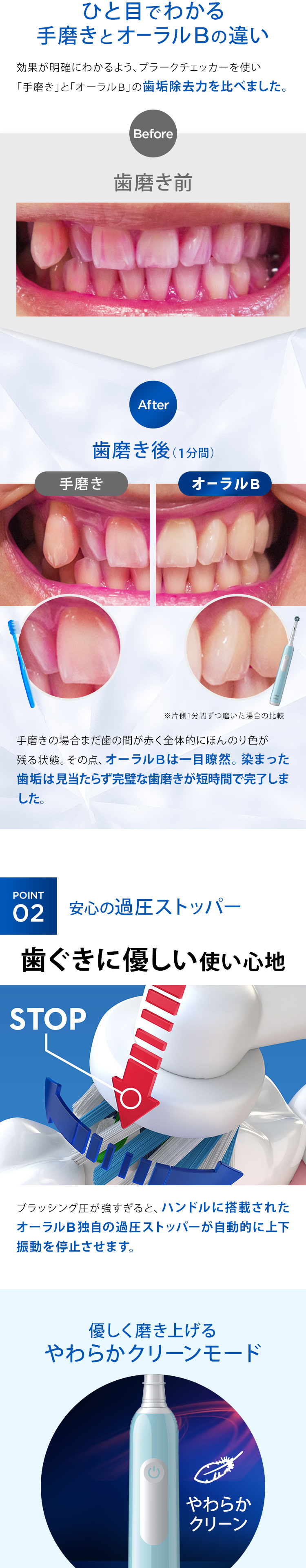 ブラシ圧が強いと、過圧ストッパーが作動し、上下運動をストップするから、歯ぐきに優しく磨けます。