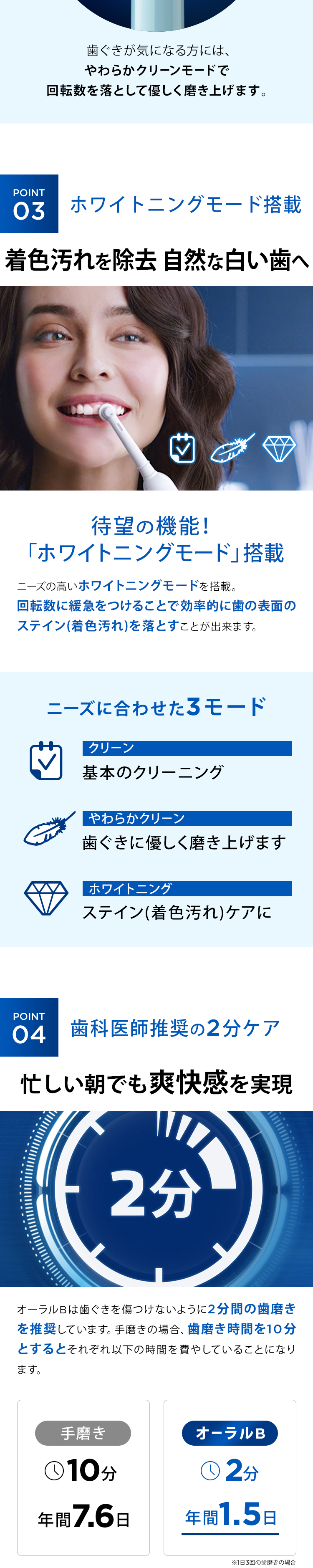標準クリーンモードをはじめ、やわらかクリーン、ホワイトニングの3モードを搭載。