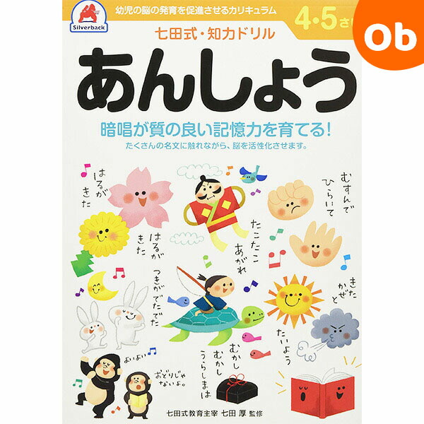 暗唱が質の良い記憶力を育てる!たくさんの名文に触れながら、脳を活性化させます。「認めて、ほめて、愛して、育てる」「右脳と左脳、バランスよく使える子に」・言葉で理解し、理論的に思考する左脳の能力に 対して、右脳は直感的でイメージを媒介とし、創造性、記憶、音楽、語学などで優秀な働きをします。両方の脳を使うことで、無限の可能性を引き出すことができるのです。「七田式ドリルを使う上で、5つのポイント」1.短所を見ないで長所、才能を見ましょう!「コレができない、ココがかけている」というイライラは禁物。子供の個性だと見方を変え長所をほめてあげましょう。2.今、完全にできていなくても、あたたかく見守りましょう!今できないことも、ある日、突然にできるもの。「ここまでよくできたね」と、今できることをほめてあげましょう。3.ほかの子供と比べるのはやめましょう!比較してしまうと、厳しい言葉が出やすくなり、信頼を失います。お子様のペースに合わせて、自発的にやりたくなるように導きます。4.学力第一に考えるのはやめましょう!右脳教育は知識を教え込むことではありません。心が豊かになり、右脳が開くことが重要です。右脳が開くと、自然・