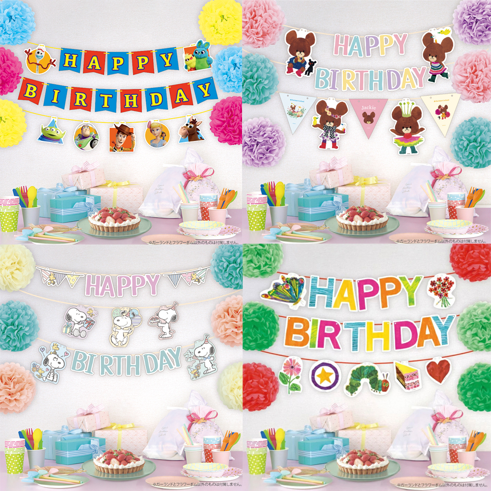 絵本でおなじみ!はらぺこあおむし、みんな大好きスヌーピー、とってもかわいいくまのがっこう、トイストーリーから選べる、バースデーデコレーションセットです。