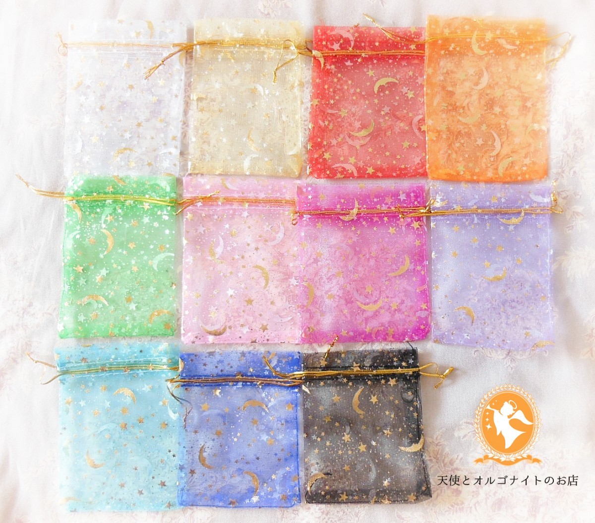 オーガンジーのミニ巾着袋 月と星 オルゴナイト ギフト ラッピングに 9×12cm 1注文100枚まで