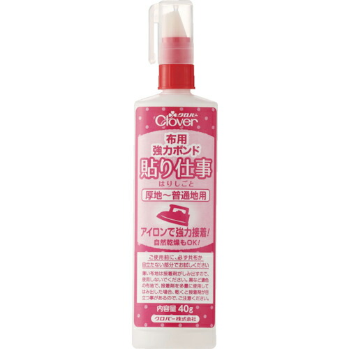 | 特長: | 普通地から厚地の布の接着用です。 乾くとほぼ透明になります。 アイロン接着で早く強力に接着します。 水洗い・ドライクリーニング(石油系)ができます。 ソフトなハケ型シリコンヘッドでヘラを使わず素早く塗れます。 接着後も硬くならず、布のソフトな風合いをキープします。 |