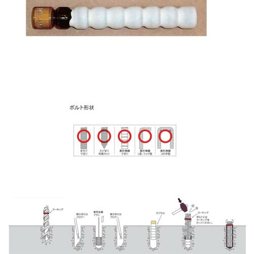 | 特長: | 厚生労働省が定めるシックハウスの原因となるVOC13品目を原材料に使用しない、健康にも環境にも配慮した接着系アンカーです。施工時に不快となるスチレン臭は全くしません。 ハンマーでたたきこむだけで簡単に施工できます。 曲げ鉄筋などの加工筋の施工が簡単にできます。 ハンマーなどで容易に施工できます。 曲げ鉄筋(L型・J型・フック型など)の施工ができます。 |