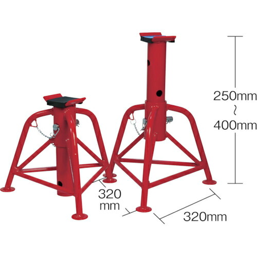 仕様: | 全長(mm):250〜400 組入数(脚):2 耐荷重(t):3 組入数(脚):2 耐荷重:3t(1脚) 高さ:1段階/250mm、2段階/325mm、最高位/400mm(ゴムパッド装着時) 本体サイズ:W320×D320×H250mm(最低位時)