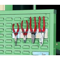 特長: | パネルコンテナラックに取り付けて、小物工具類、各種ペンチなどフックに引掛けられない工具の整理・整頓に最適です。 パネル付の部品管理ラックやツールワゴンなどに取り付けるのが、有効です。