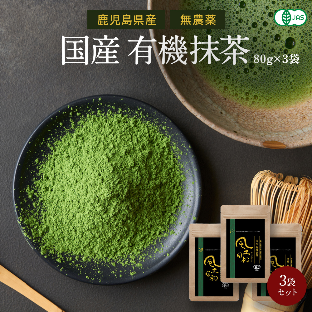 抹茶 有機JAS認定 鹿児島産 粉末 オーガニック 80gx3袋 国産 無農薬 無添加 パウダー カテキン 碾茶 粉茶 日本茶 スイーツ ラテ 風土日和