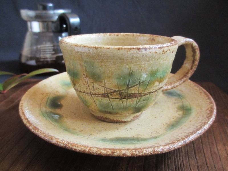 カップ&ソーサー 黄瀬戸 草原紋 デミタス碗皿 康元窯 佐藤公一郎