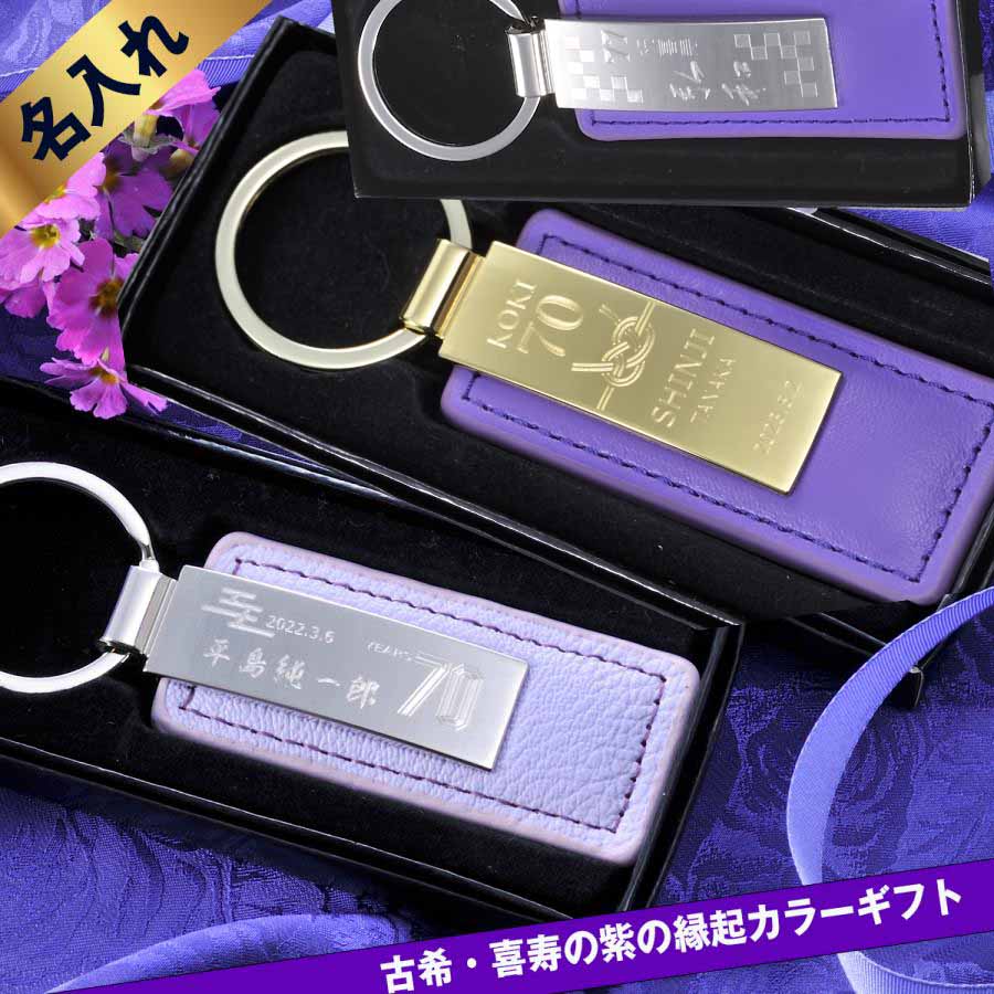 名入れ ギフト 古希 喜寿 縁起カラー キーリング 誕生日プレゼント 革 おしゃれ カラーレザー メタルプレート キーホルダー パープル